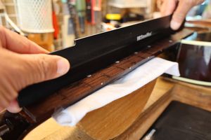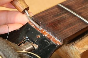 - 5.フレット溝の中のゴミ類を削り出します。このときもフレット溝エッジを傷つけないように注意します。
