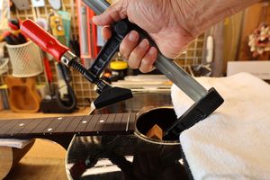 - 22.ストリングリフターで弦を待避させて、ナット溝を徐々に下げていきます。