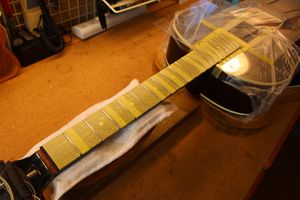 - 29.引き続いてフレットすりあわせを行いましょう。マスキングテープでフィンガーボードを保護します。