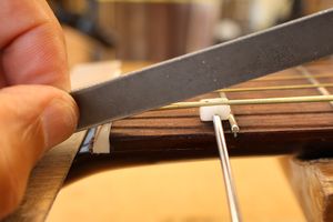 - 21.弦を張って弦高調整を行います。2フレットを指で押さえて1フレットと弦の隙間がギリギリに下がるまでナット高を下げます。
