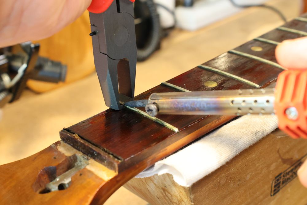 - 1.フレットを抜いていきましょう。はんだごてでフレットを暖めながらゆっくり抜いていきます。