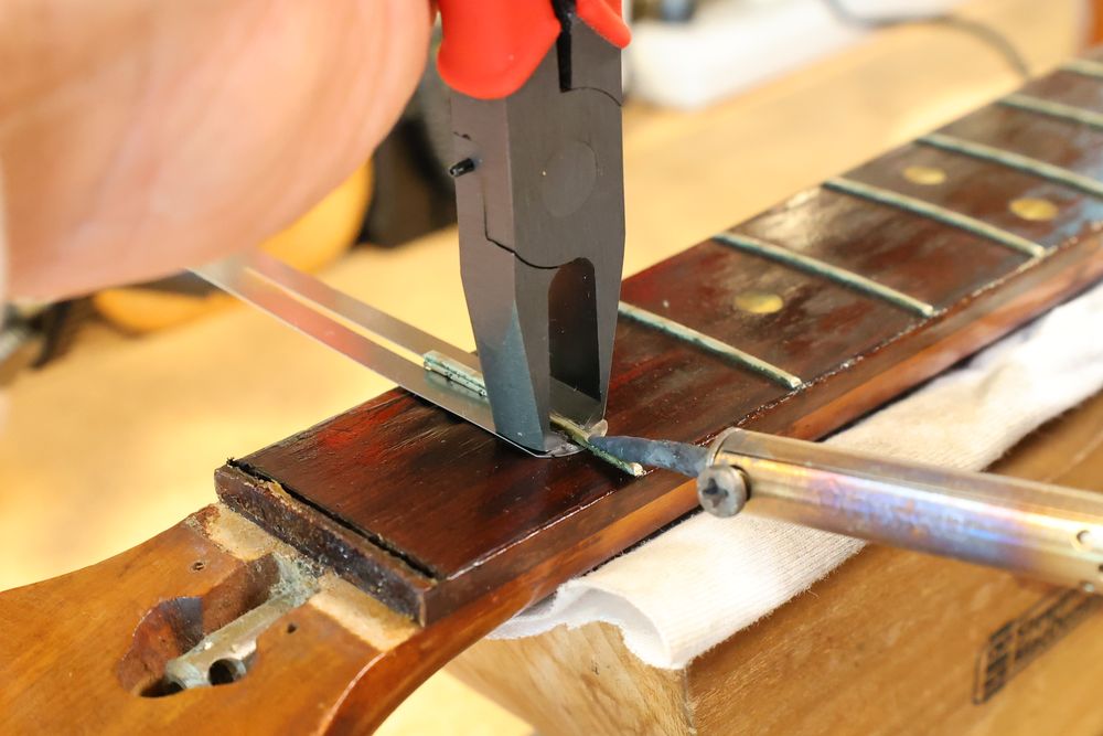 - 10.フレットをフィンガーボード幅よりも少し大きめに切り取ります。