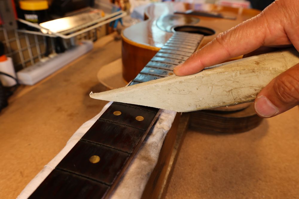 - 5.フレット溝の中のゴミ類を削り出します。このときもフレット溝エッジを傷つけないように注意します。