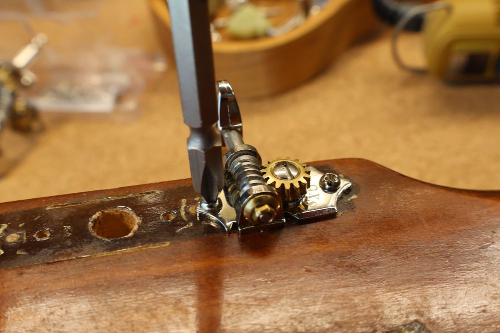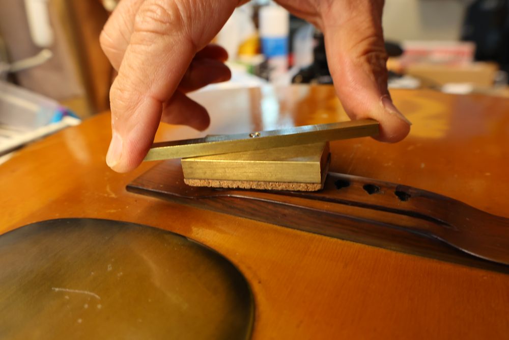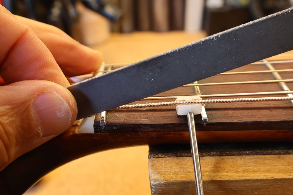 - 22.ストリングリフターで弦を待避させて、ナット溝を徐々に下げていきます。