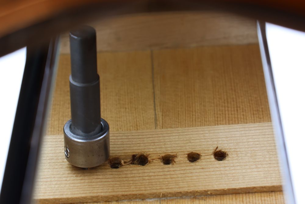 - 11.さらにミニルーターで弦の導出角度をつけていきます。