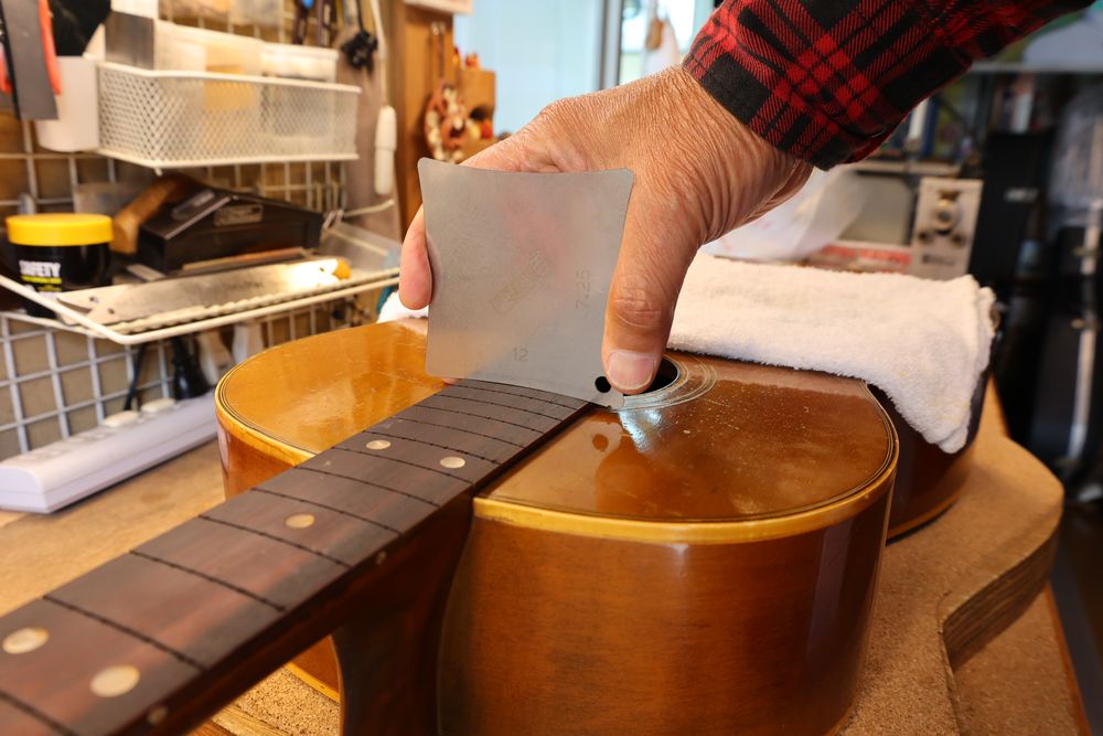- 8.フィンガーボードの湾曲度(アール)を計測します。