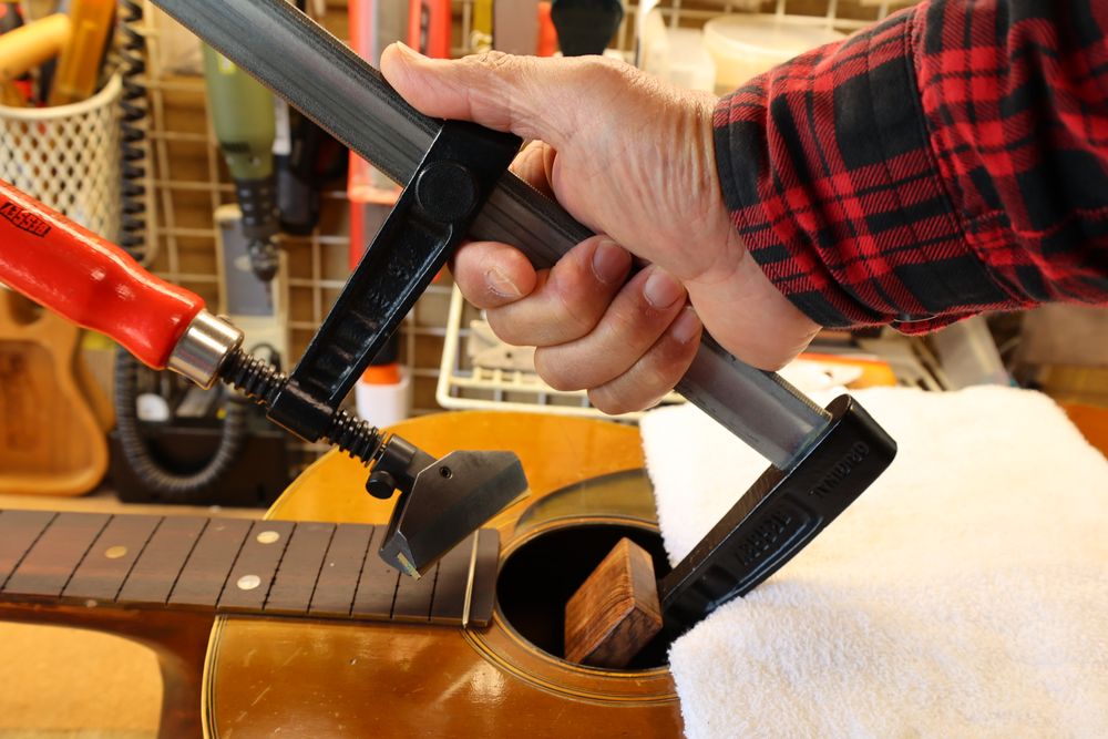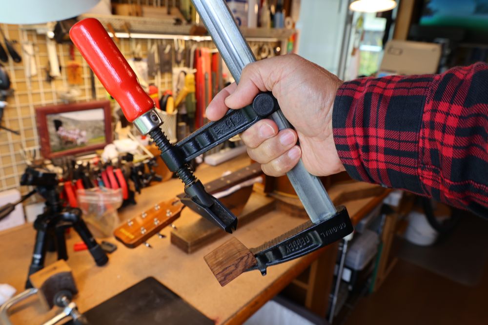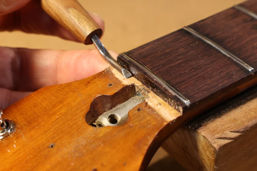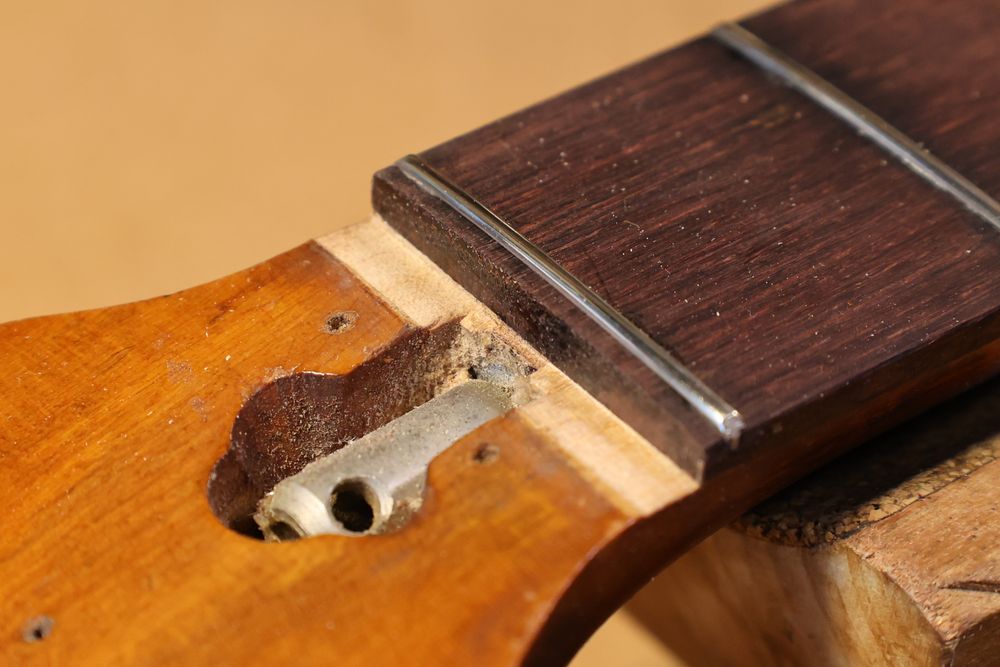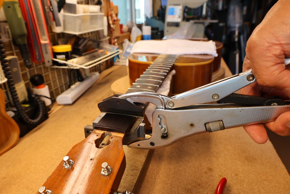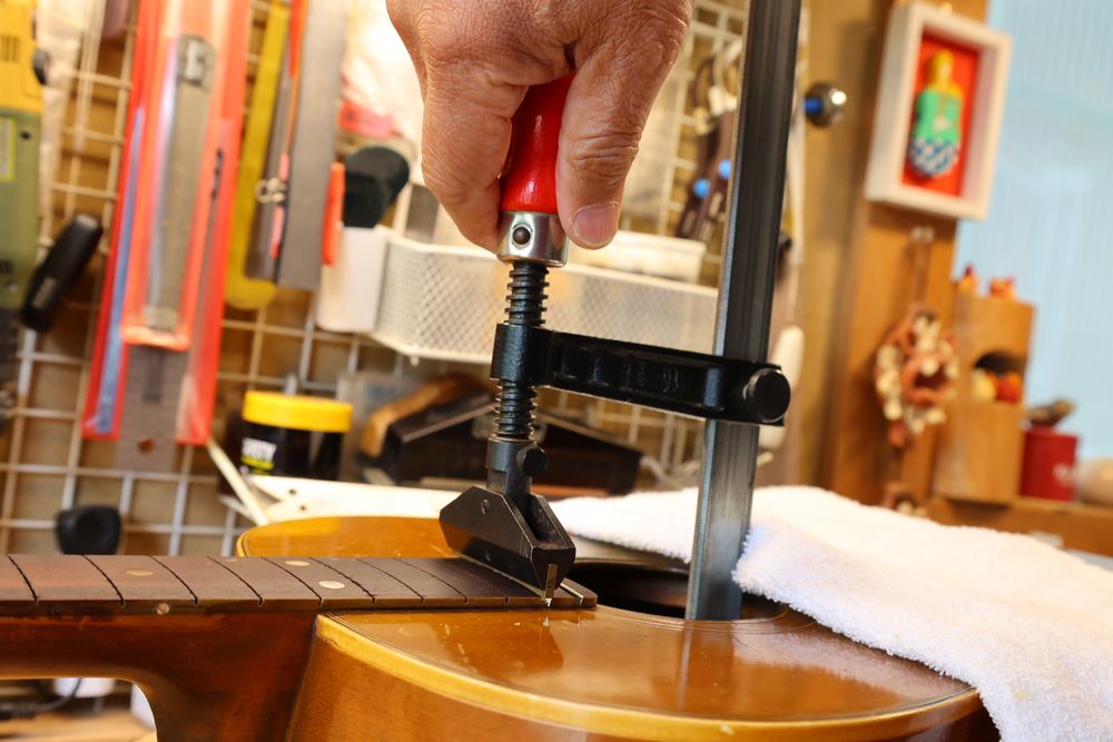 - 12.目視および指で触ってネック、フィンガーボードと段差のないことを確認しておきます。