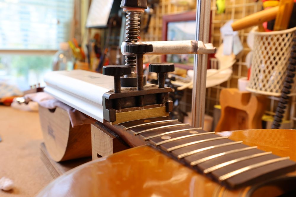 - 9.フレットベンダーでフレットにアールをつけていきます。