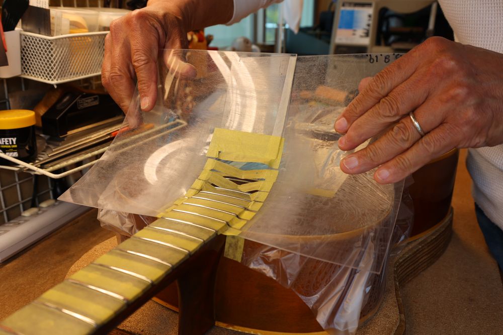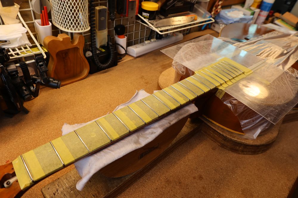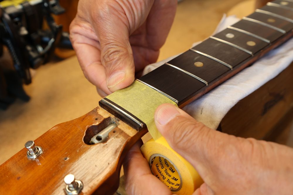 - 29.引き続いてフレットすりあわせを行いましょう。マスキングテープでフィンガーボードを保護します。