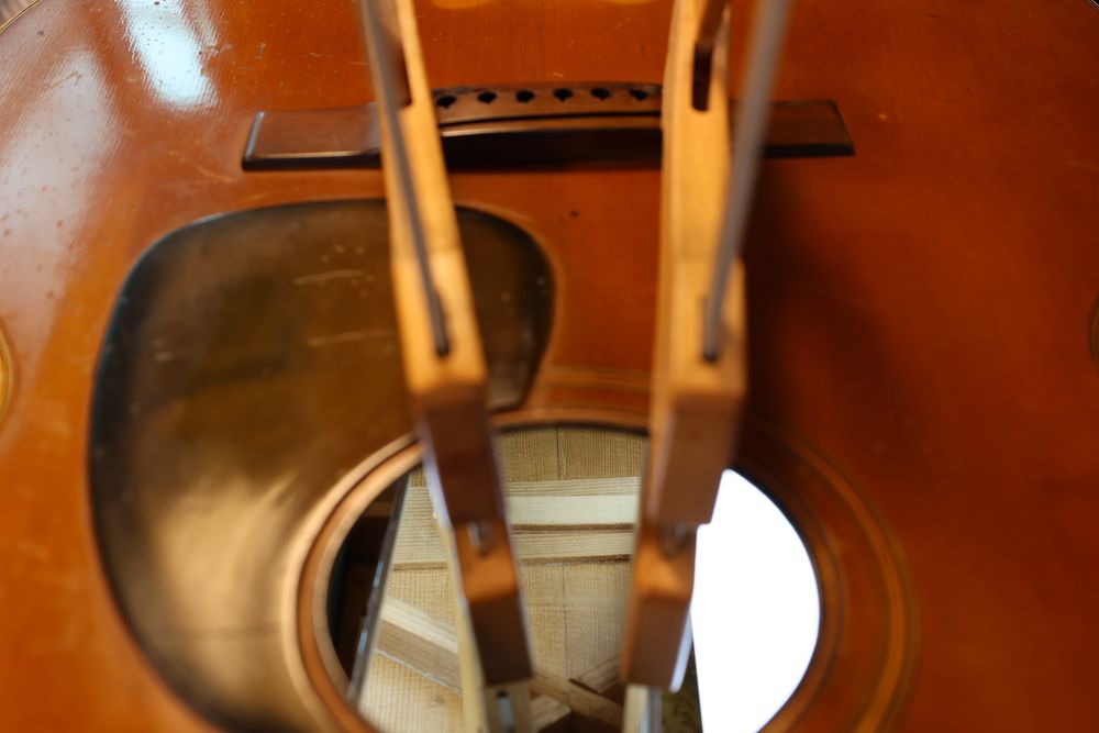 - 1.サウンドホールにチューナー、サドル位置にイントネーターを取り付けました。