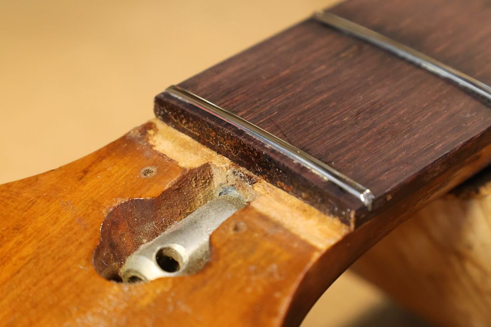 特にネック元起きが顕著で、本来であればネックリセットが必要なのですが、残念ながら対応していない個体でしたので、弦周りリペアのみで弦高をどこまで下げることができるか不安でした。