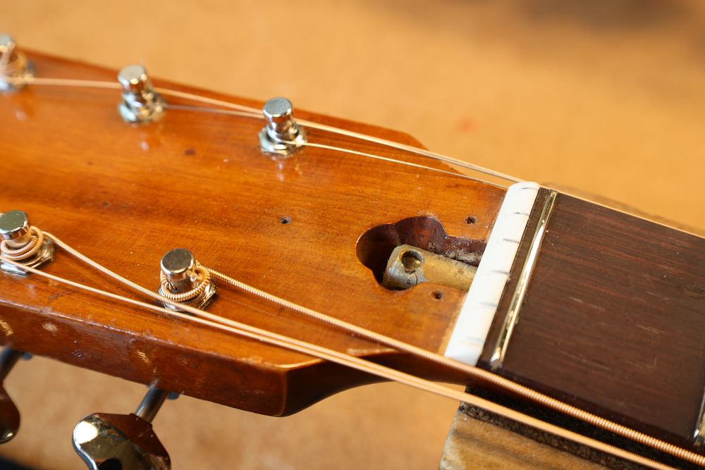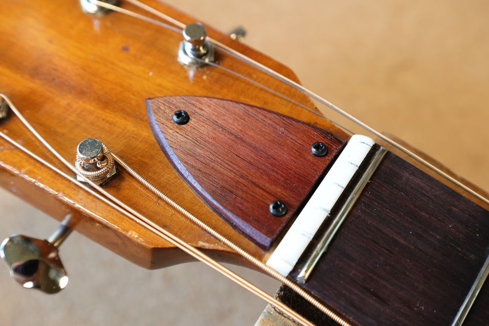 - 1.リペア前のヘッド部です。1弦ペグポールが欠損しています。