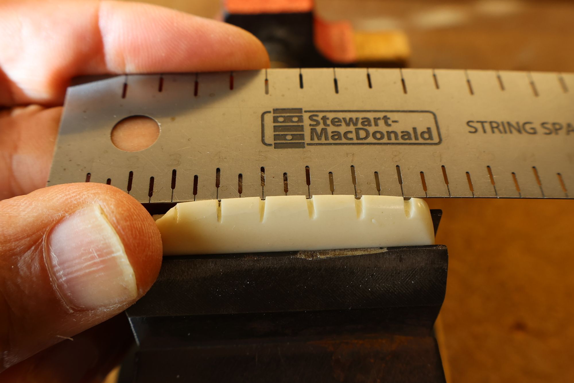- 18.弦溝位置を新しいナットに書き込みます。