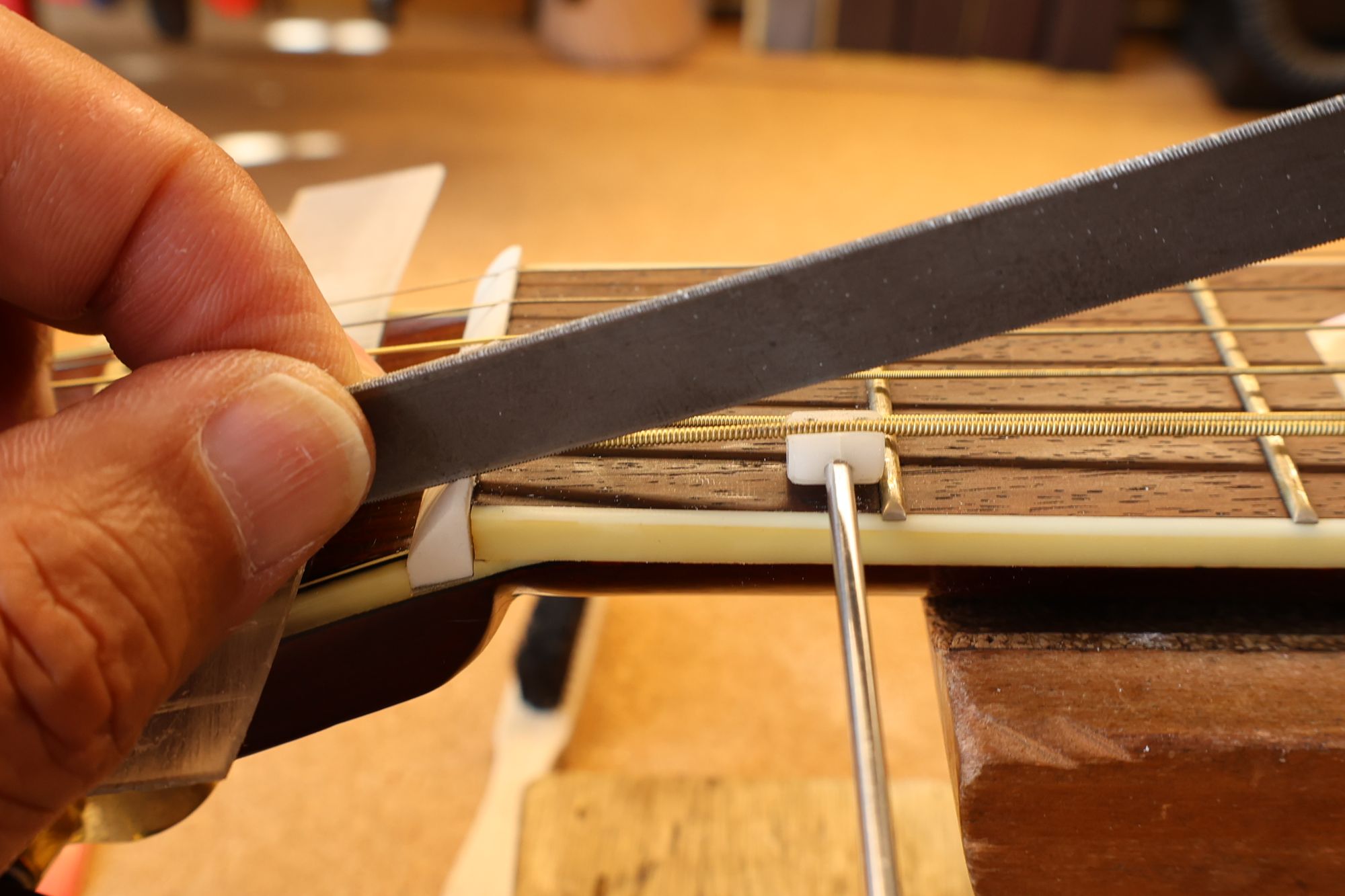 - 22.ストリングリフターで弦を待避させて、ナット溝を徐々に下げていきます。