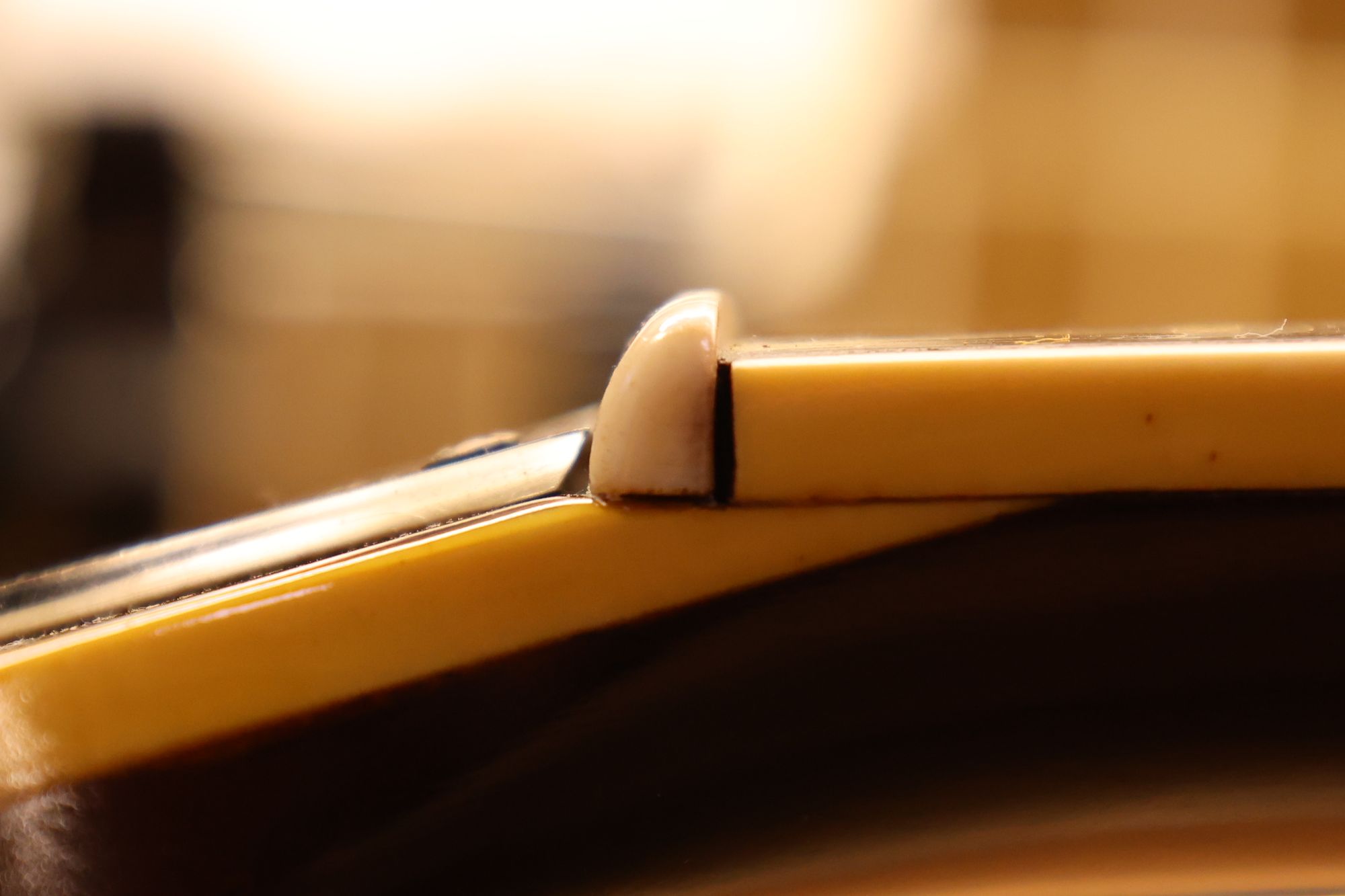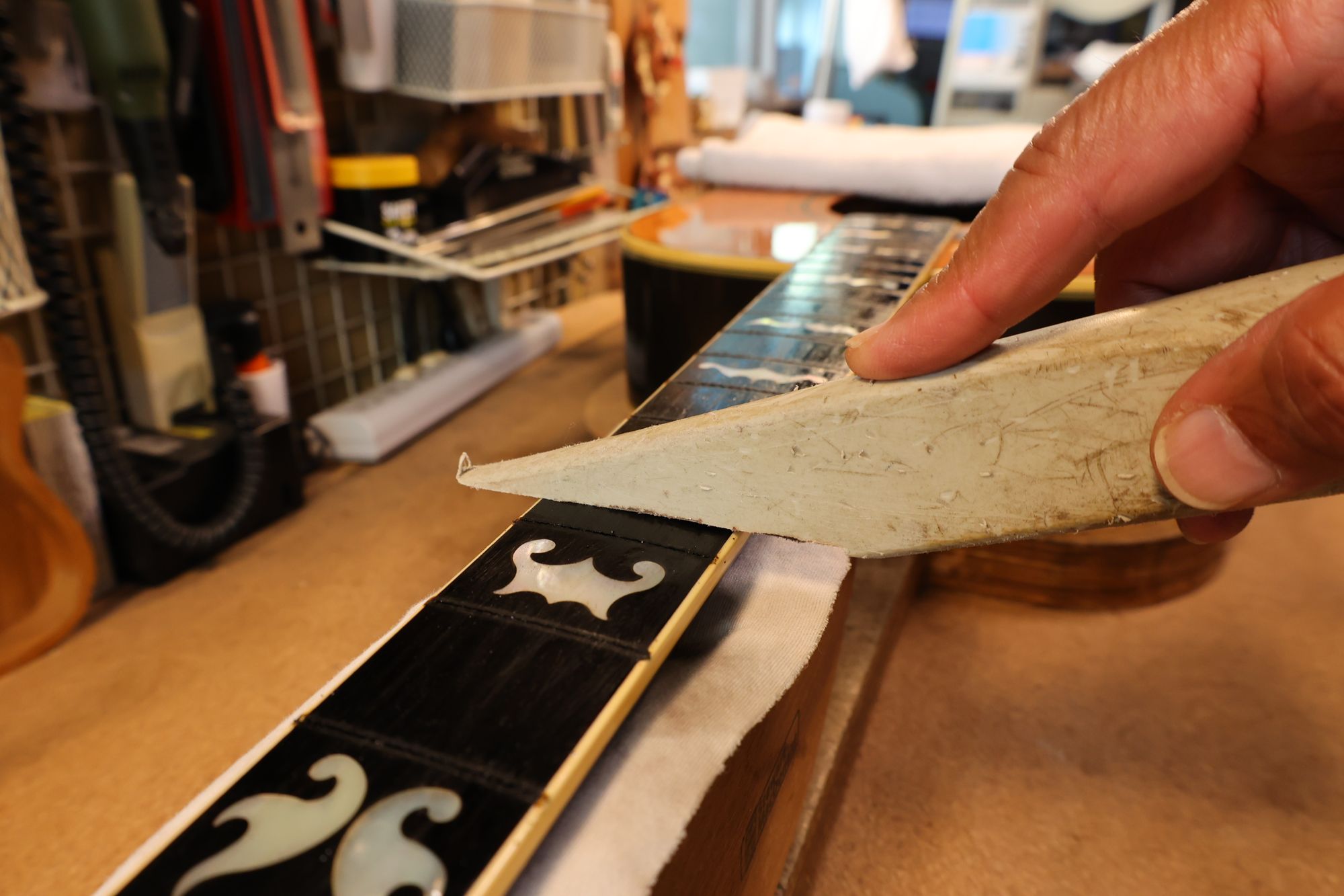 - 12.目視および指で触ってネック、フィンガーボードと段差のないことを確認しておきます。