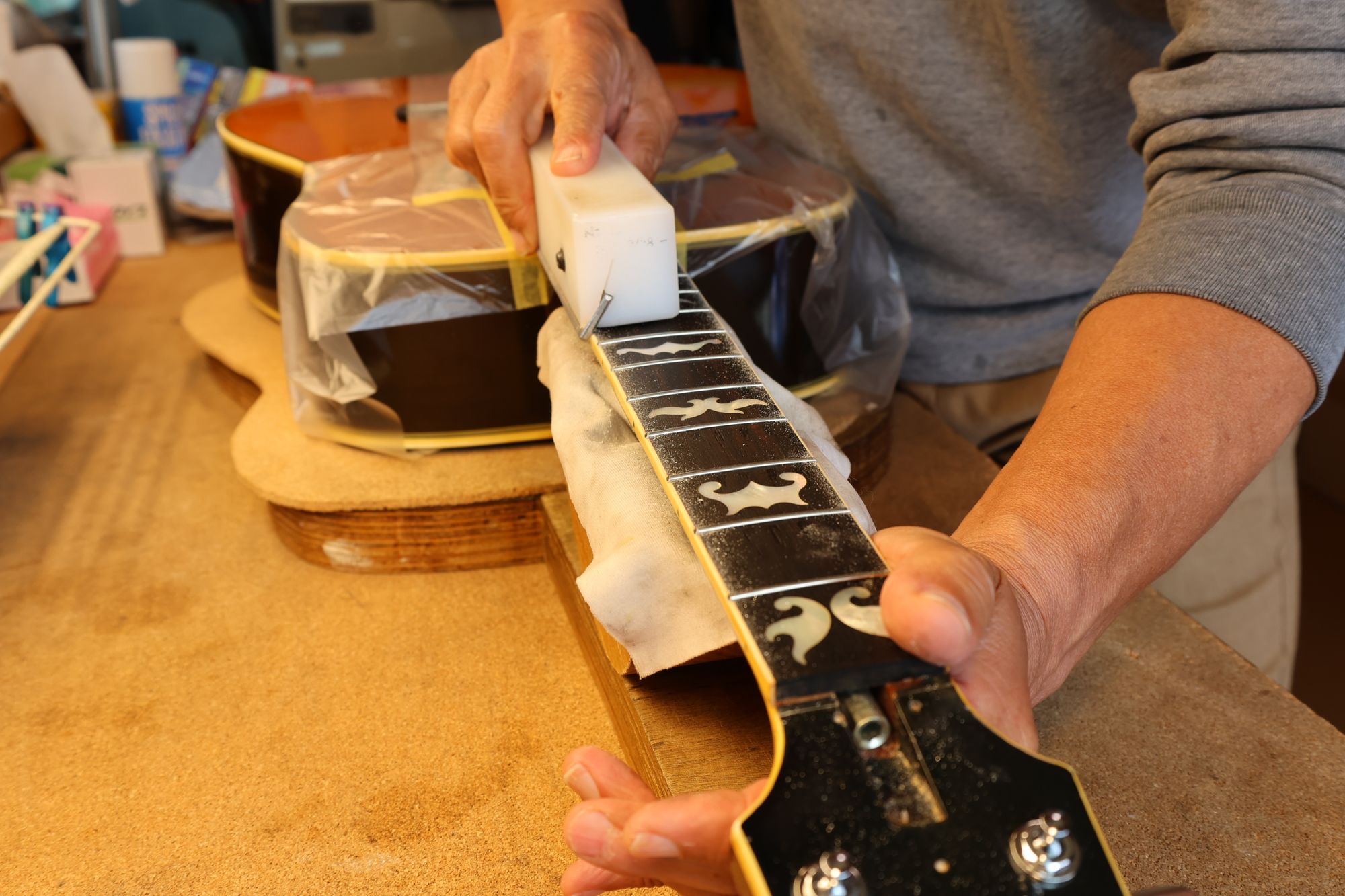 - 31.引き続いてフレットすりあわせを行いましょう。マスキングテープでフィンガーボードを保護します。