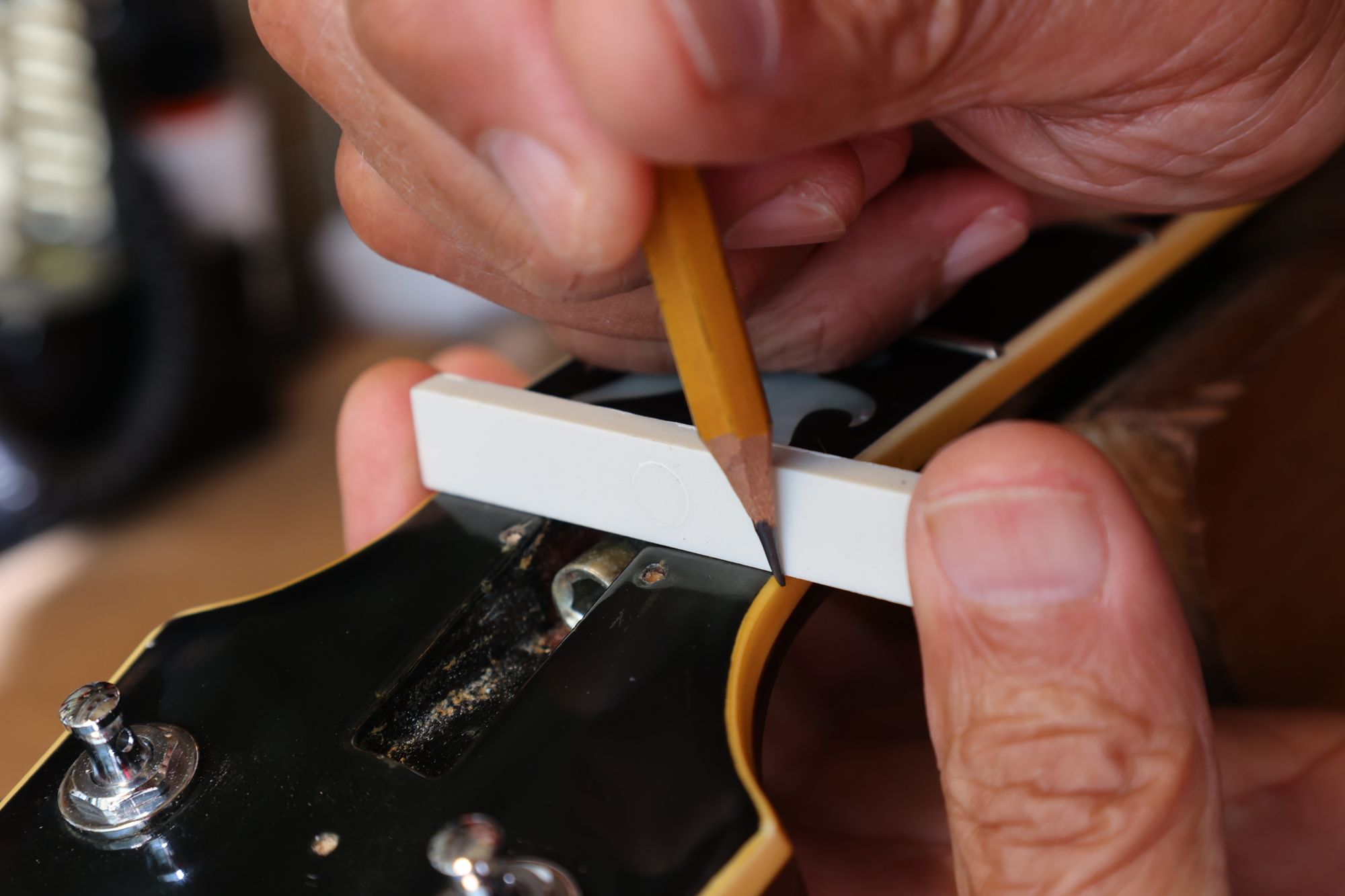 - 16.弦溝位置を新しいナットに書き込みます。