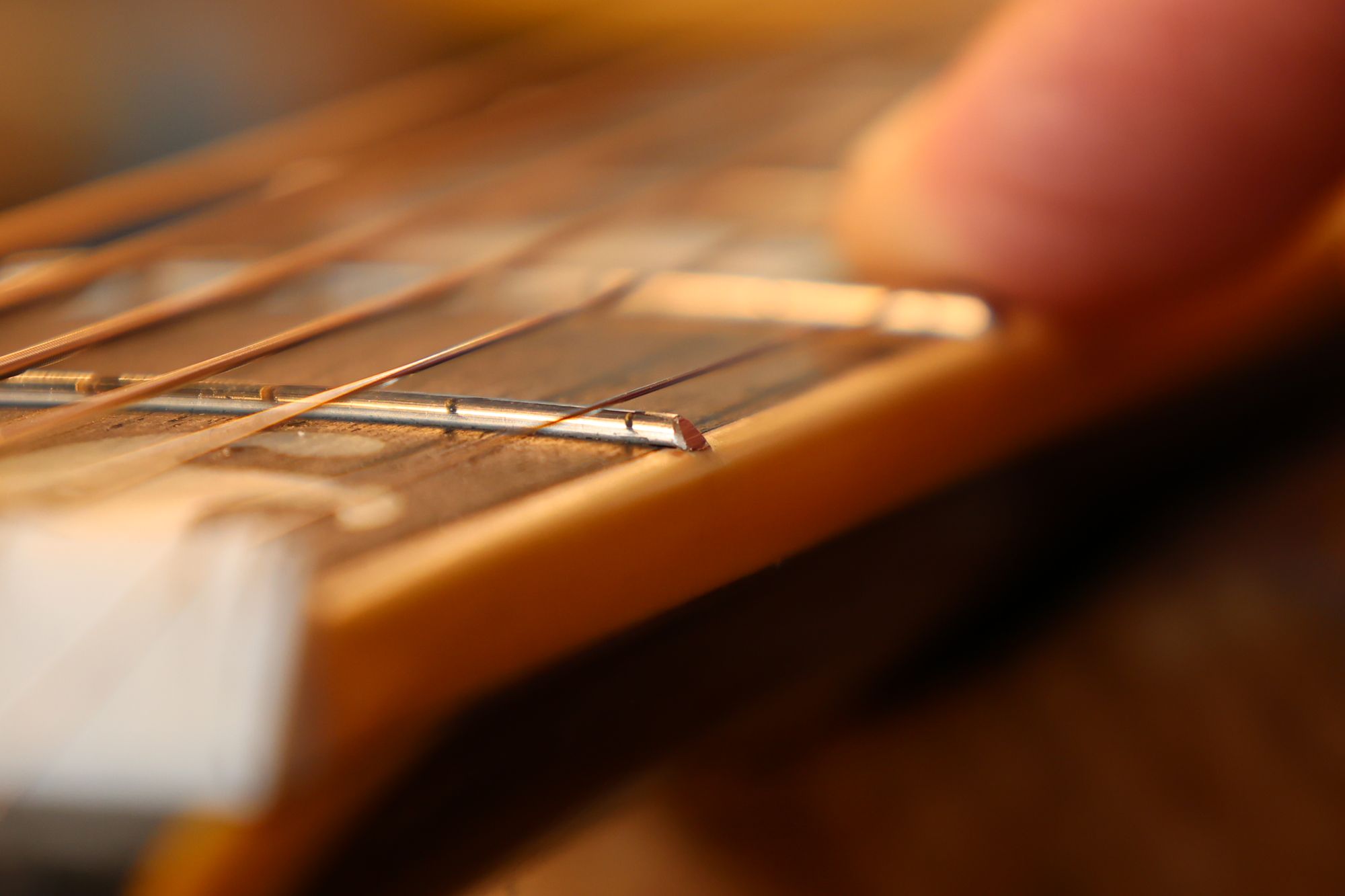 - 19.弦を張って弦高調整を行います。2フレットを指で押さえて1フレットと弦の隙間がギリギリに下がるまでナット高を下げます。