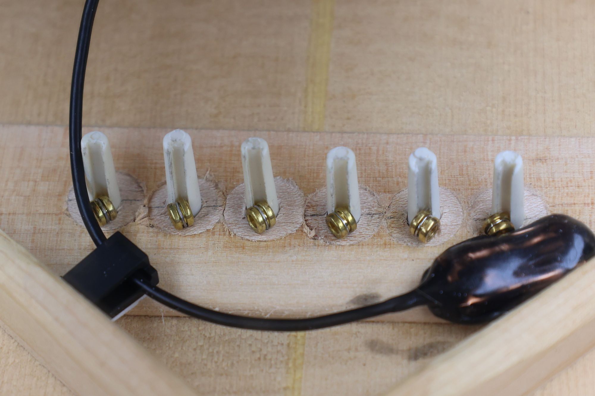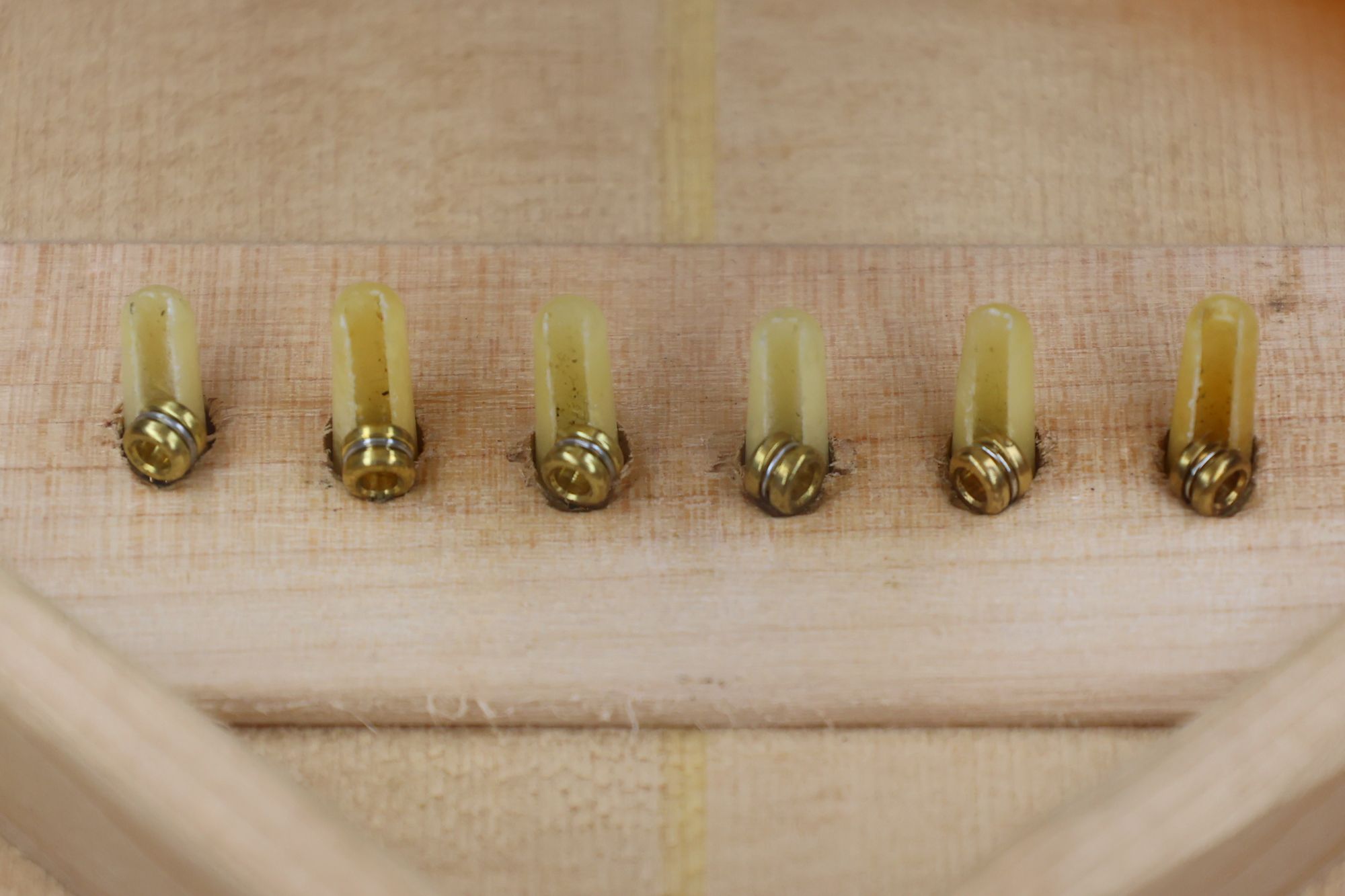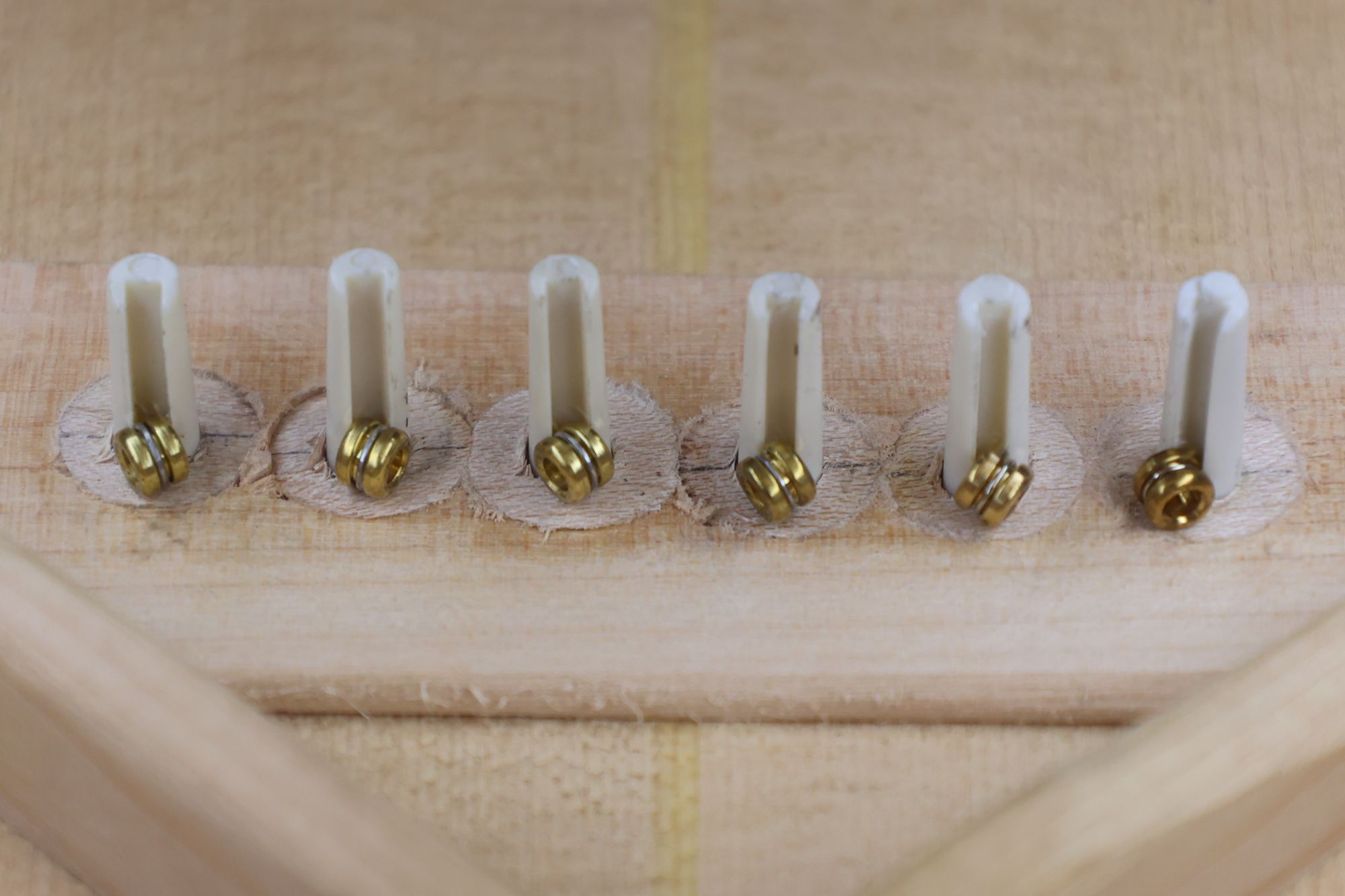 - 19.1,3,5弦のプラグ固着後、同じように2,4,6弦のプラグ接着を行います。