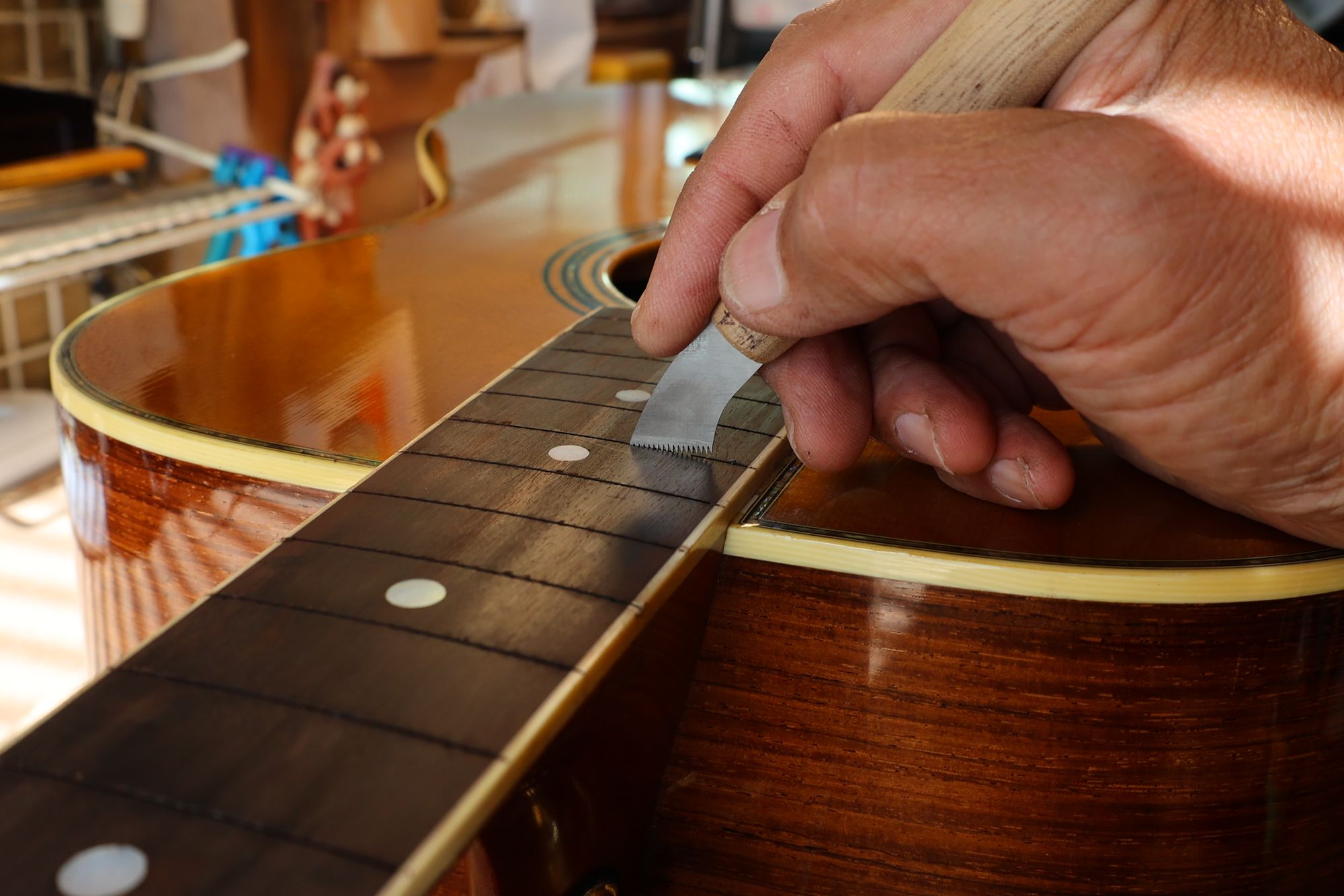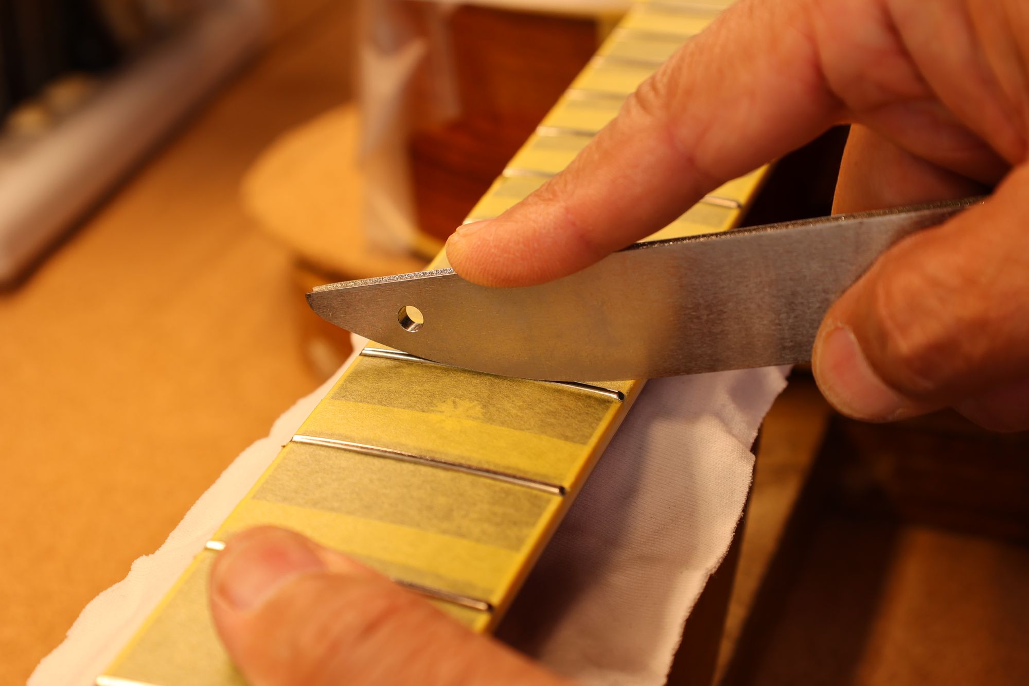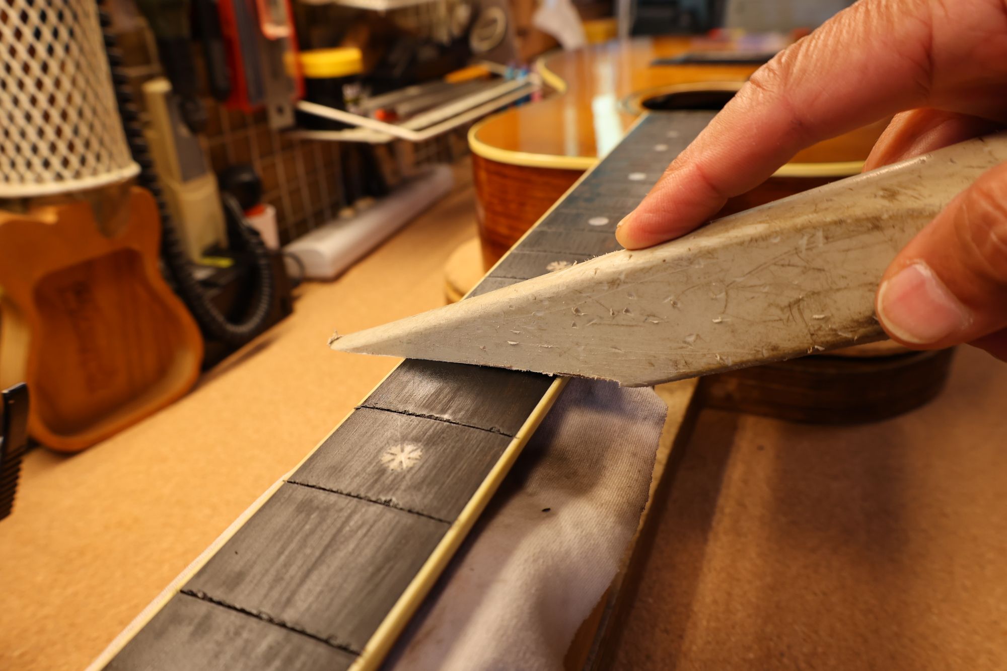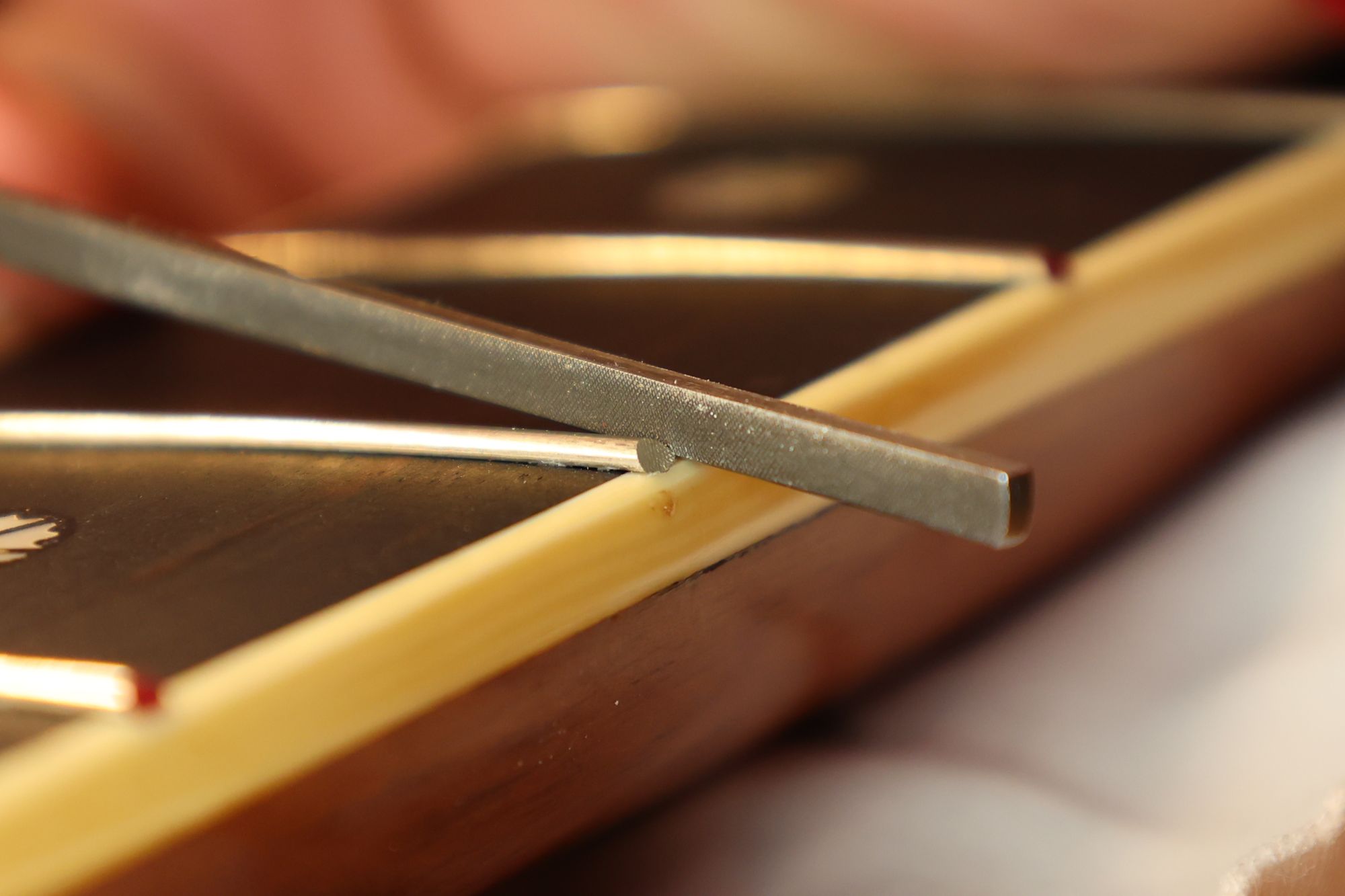- 31.専用のヤスリを使ってフレット端を整形します。