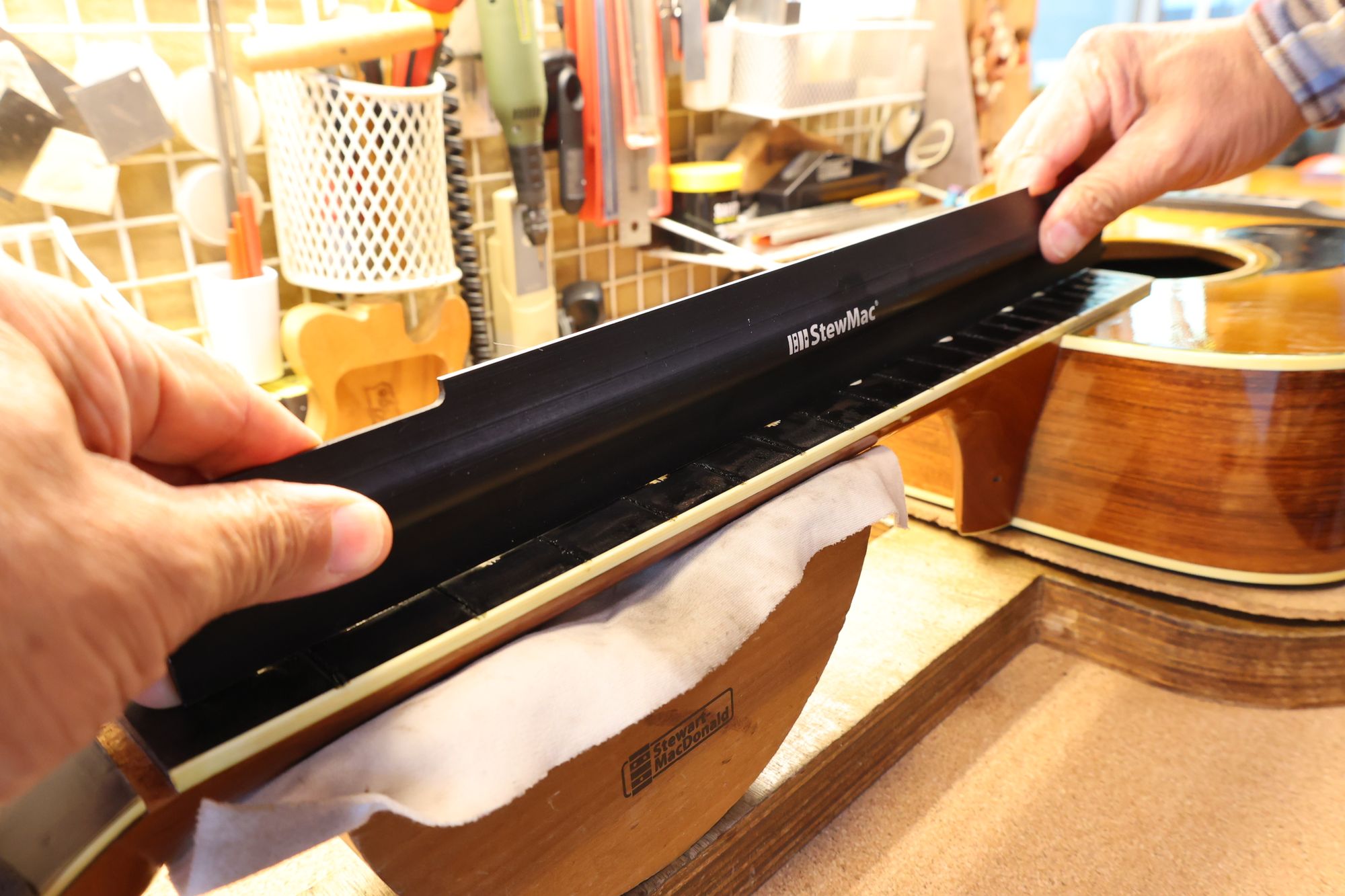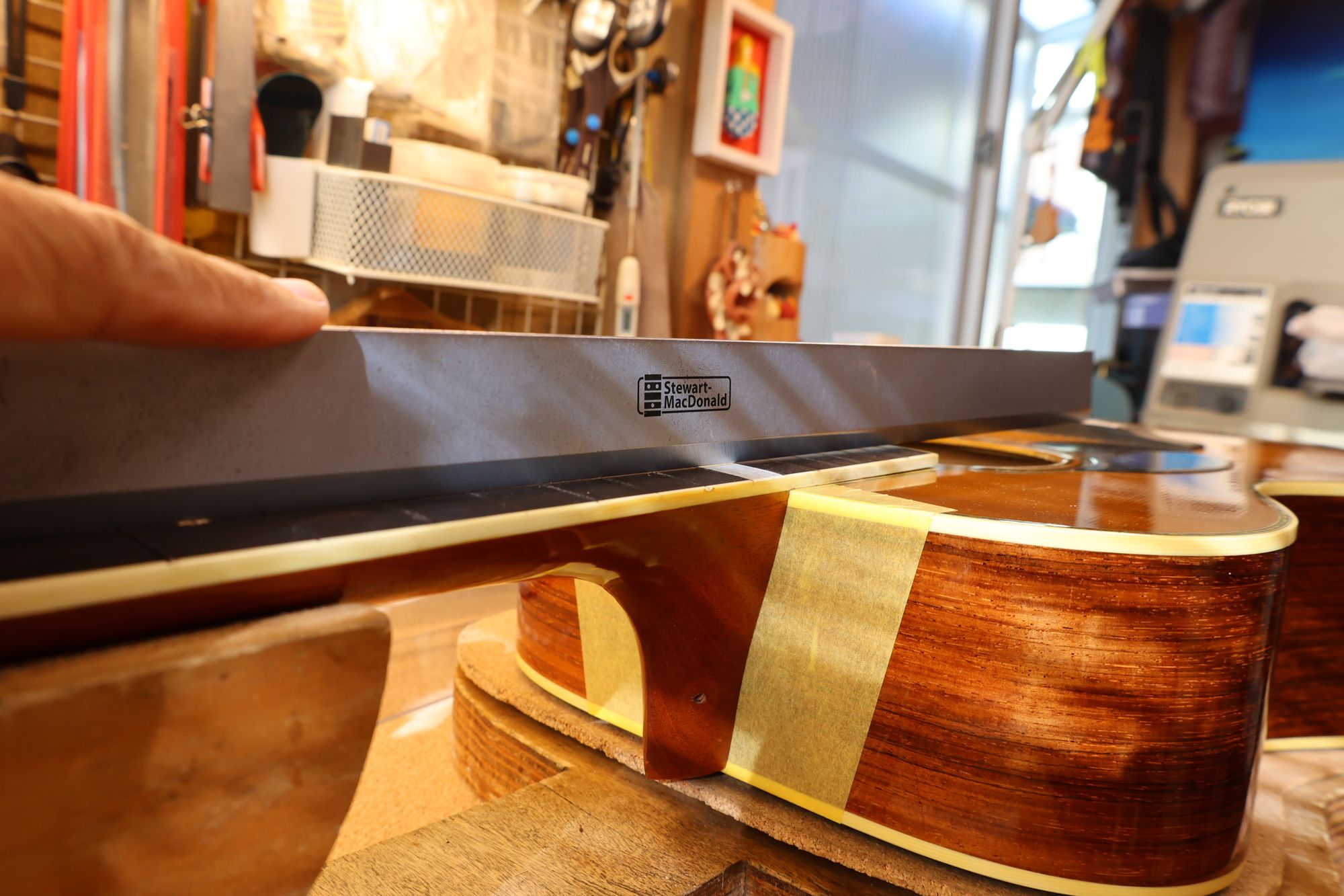 - ネックとボディの直線性と取り付け角度を確認している様子です。