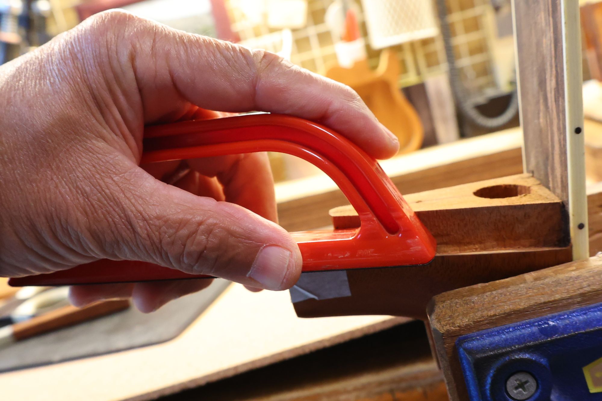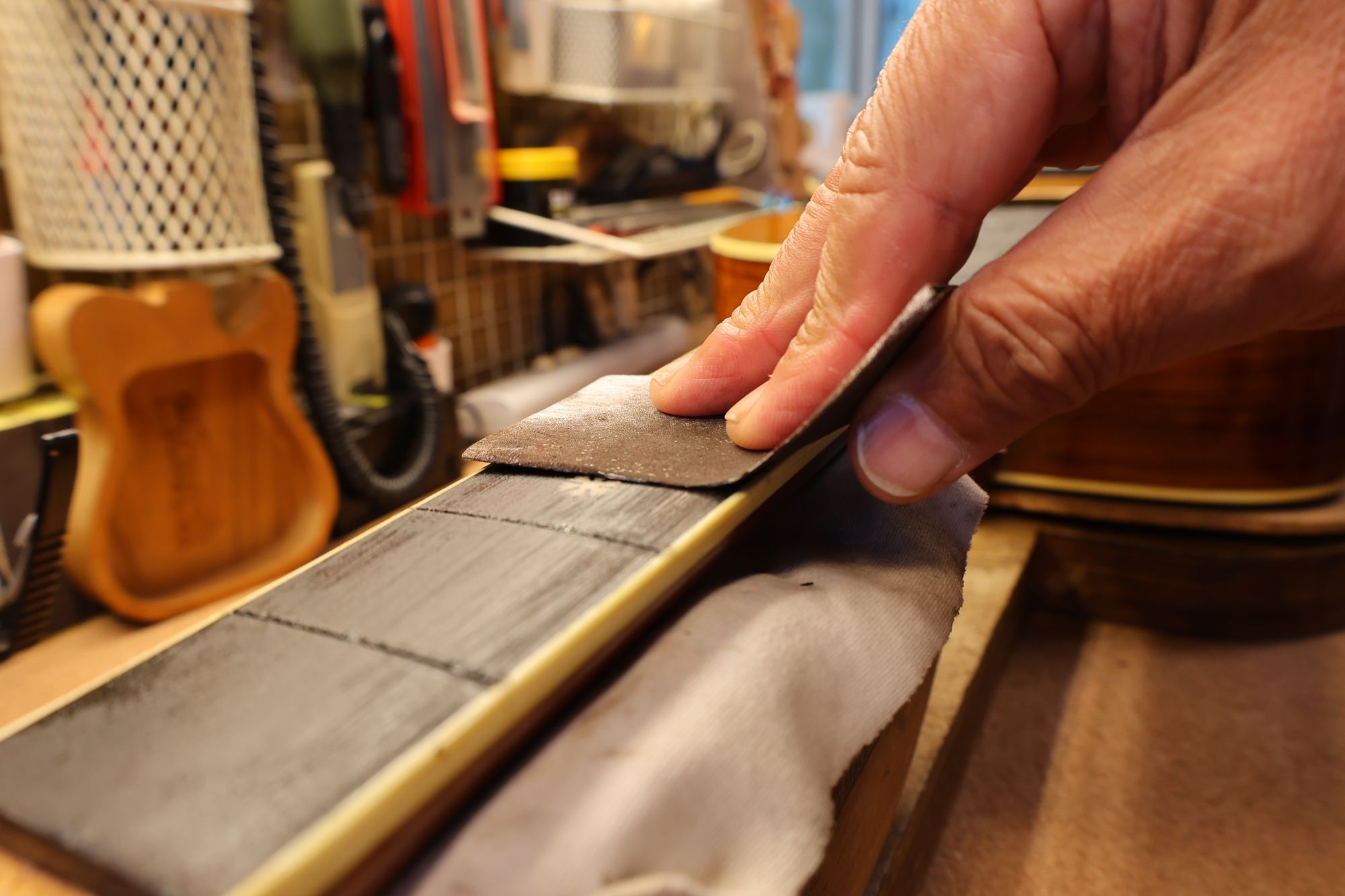 - 29.ネックとボディの間にサンドペーパーを挟みます。