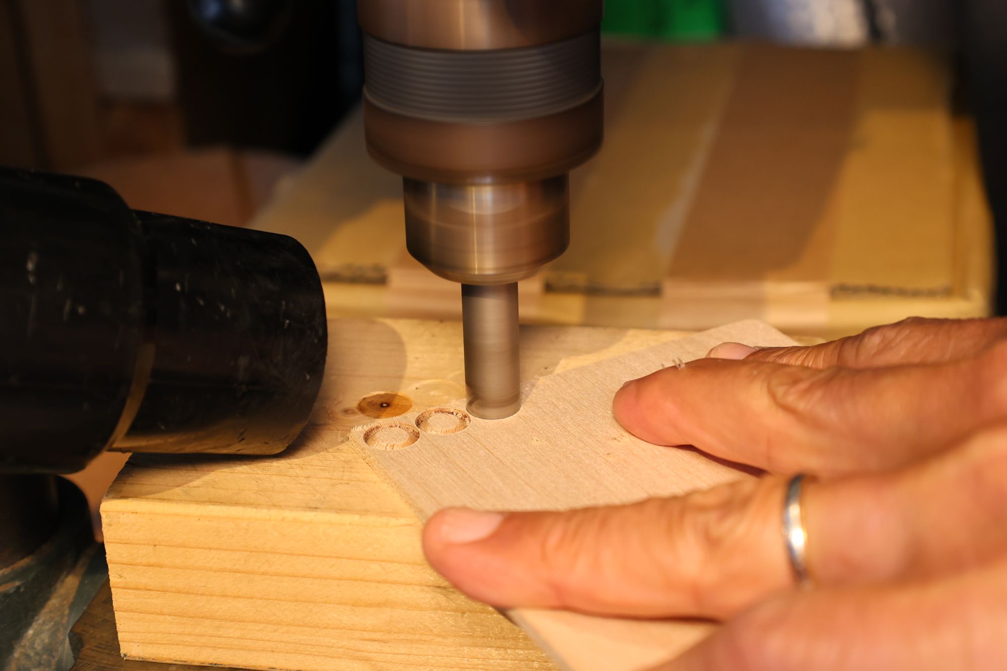 - ネックポケットへのアクセスホールを空けている様子です。