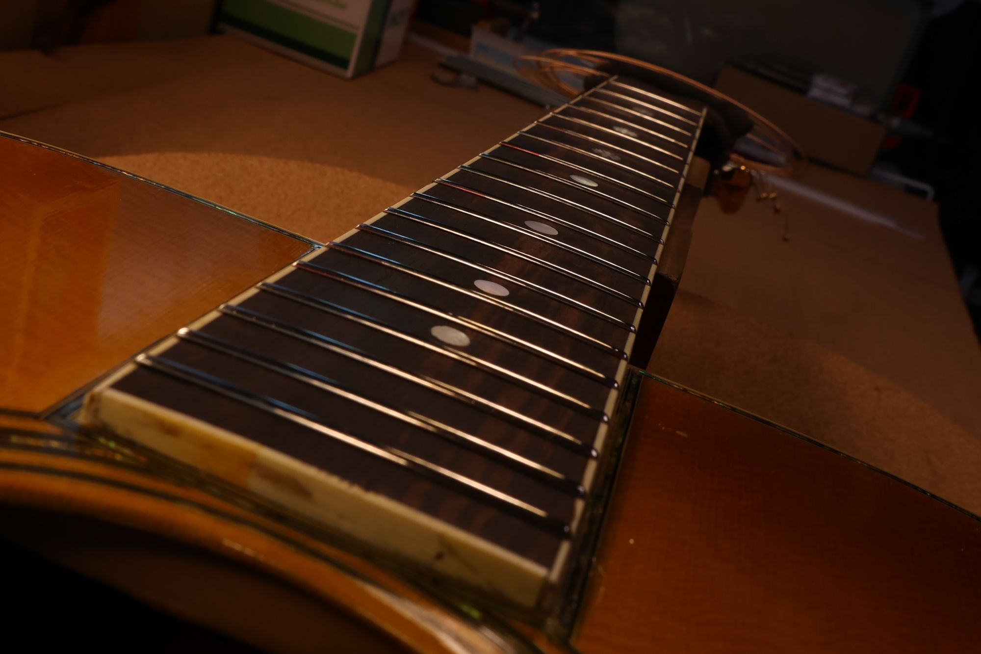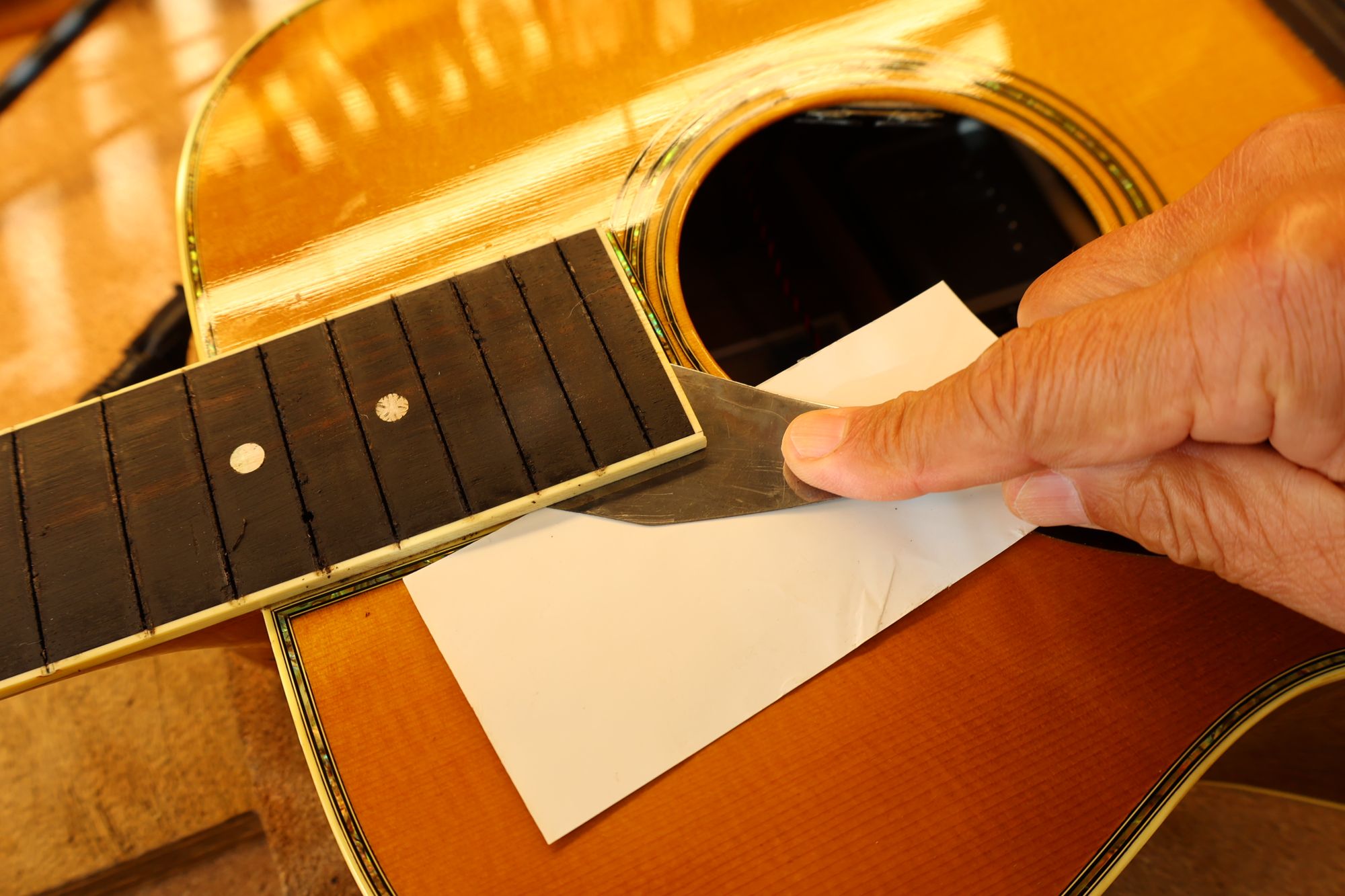 - 12.目視および指で触ってネック、フィンガーボードと段差のないことを確認しておきます。