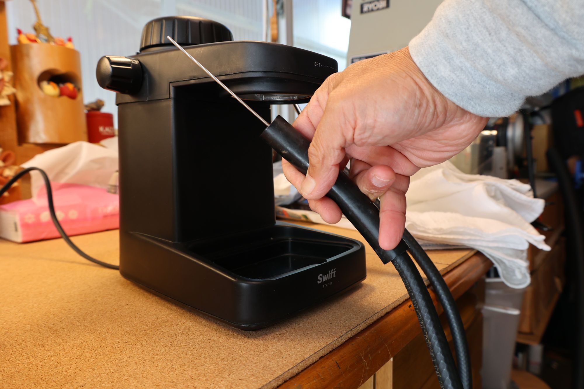 - 11.蒸気発生用のエスプレッソメーカーにホースと蒸気注入ジグを取り付けます。