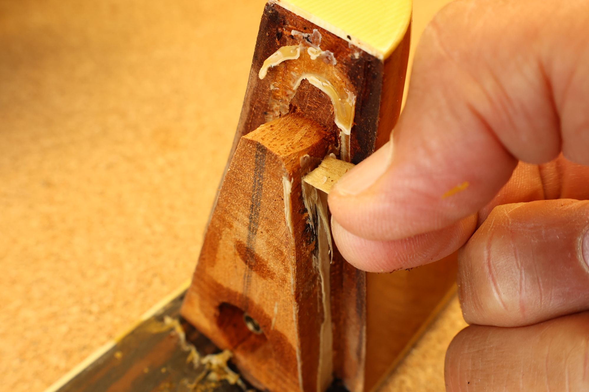 - 14.ジグを取り外してジョイント部に残った古い接着剤(ニカワ)をクリーニングしましょう。