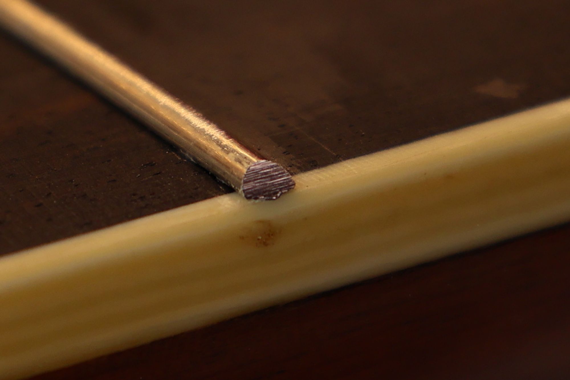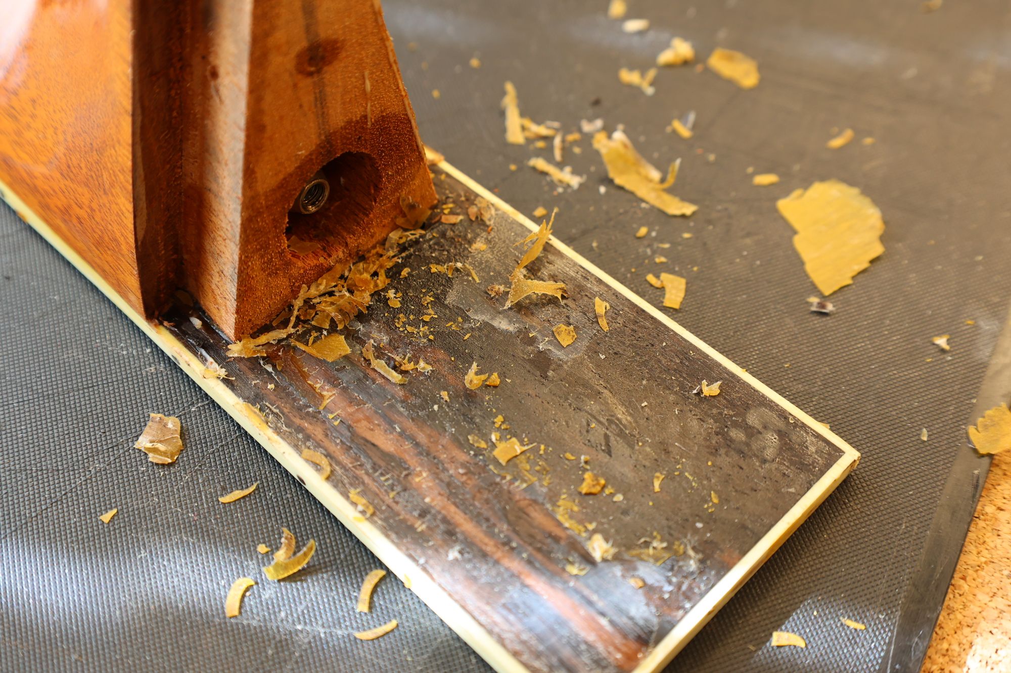 - 4.ドリル穴にエボニー材を押し込み、フィンガーボードを傷つけないように出た部分をカットします。