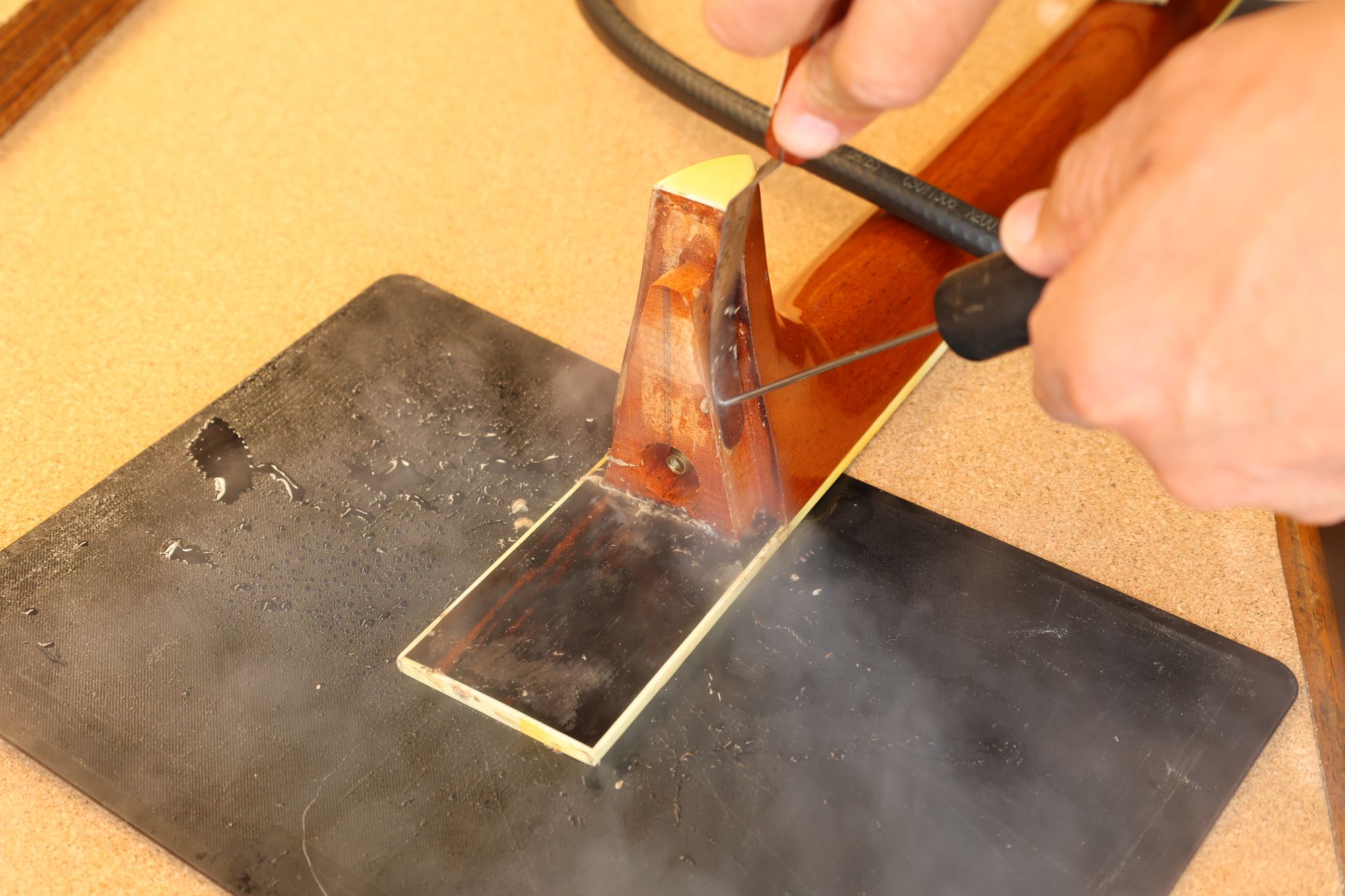 - 4.ラバーヒーターを使ってフィンガーボードを暖めます。