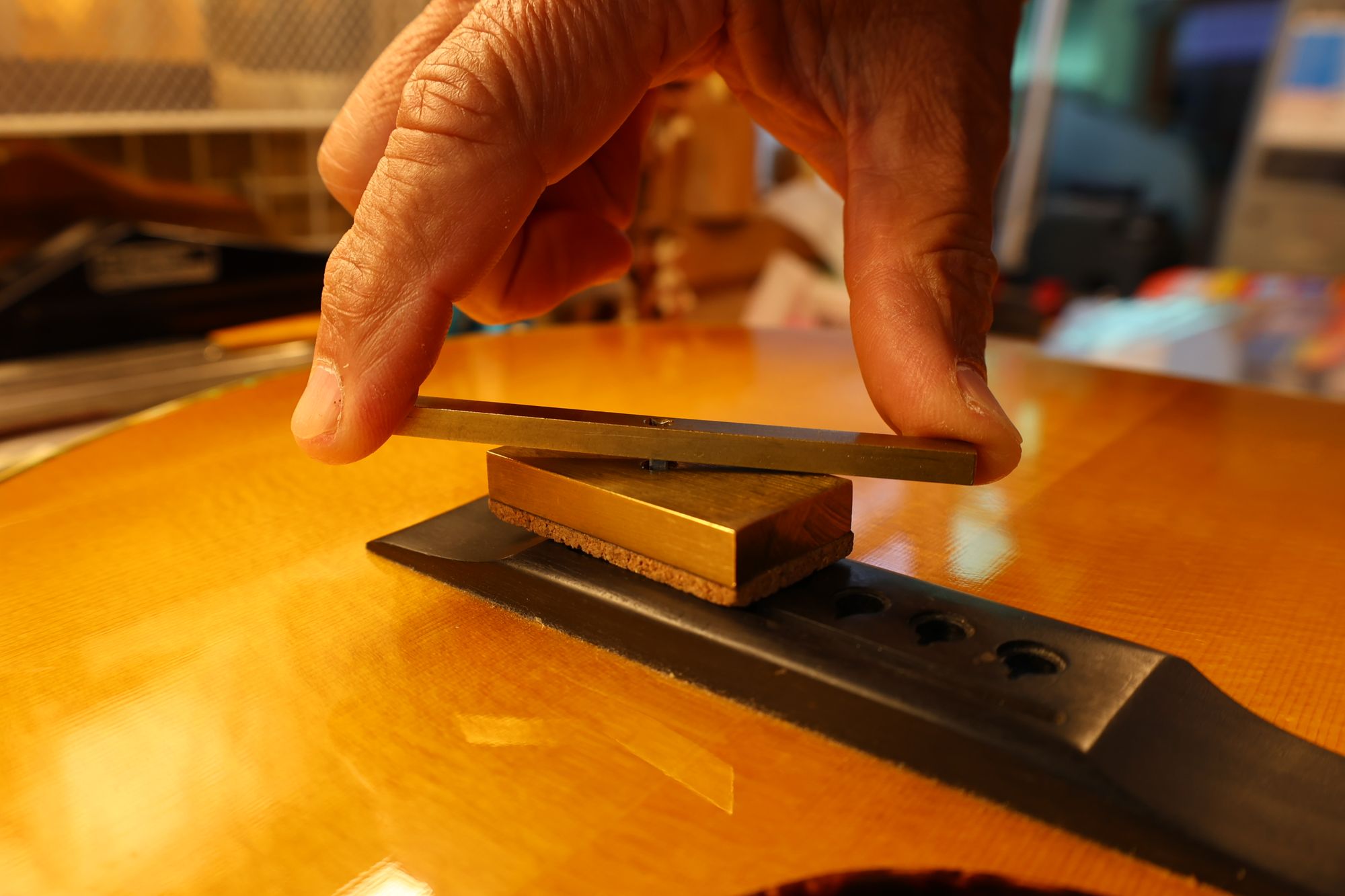 - 37.フィンガーボードがブリッジ面上端を指すようにネック取り付け角度を調整しました。