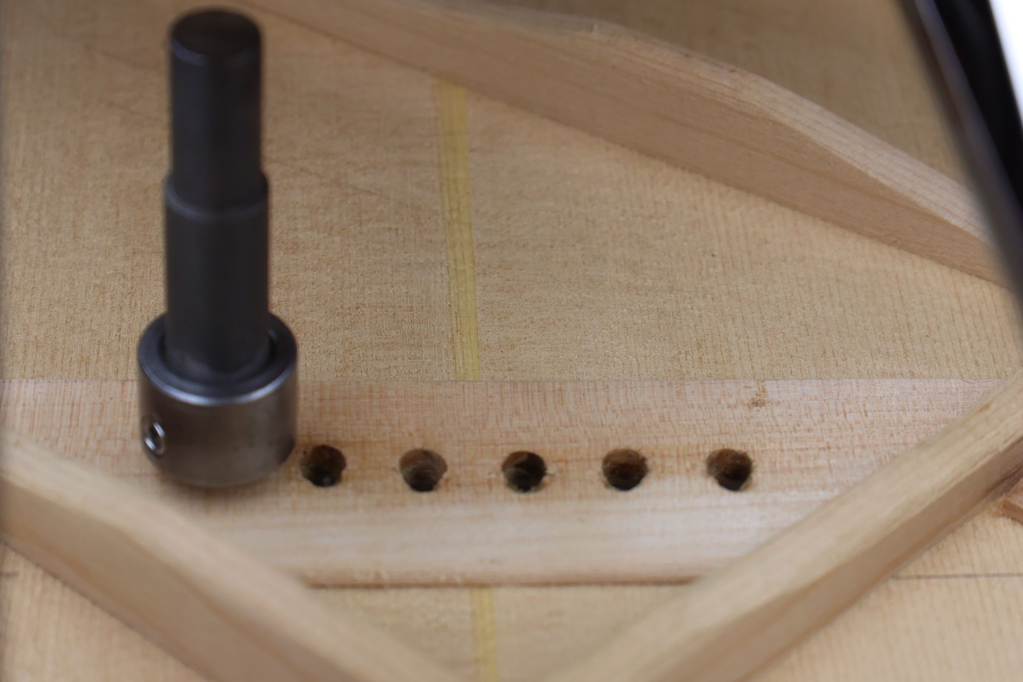- 13.さらにミニルーターで弦の導出角度をつけていきます。
