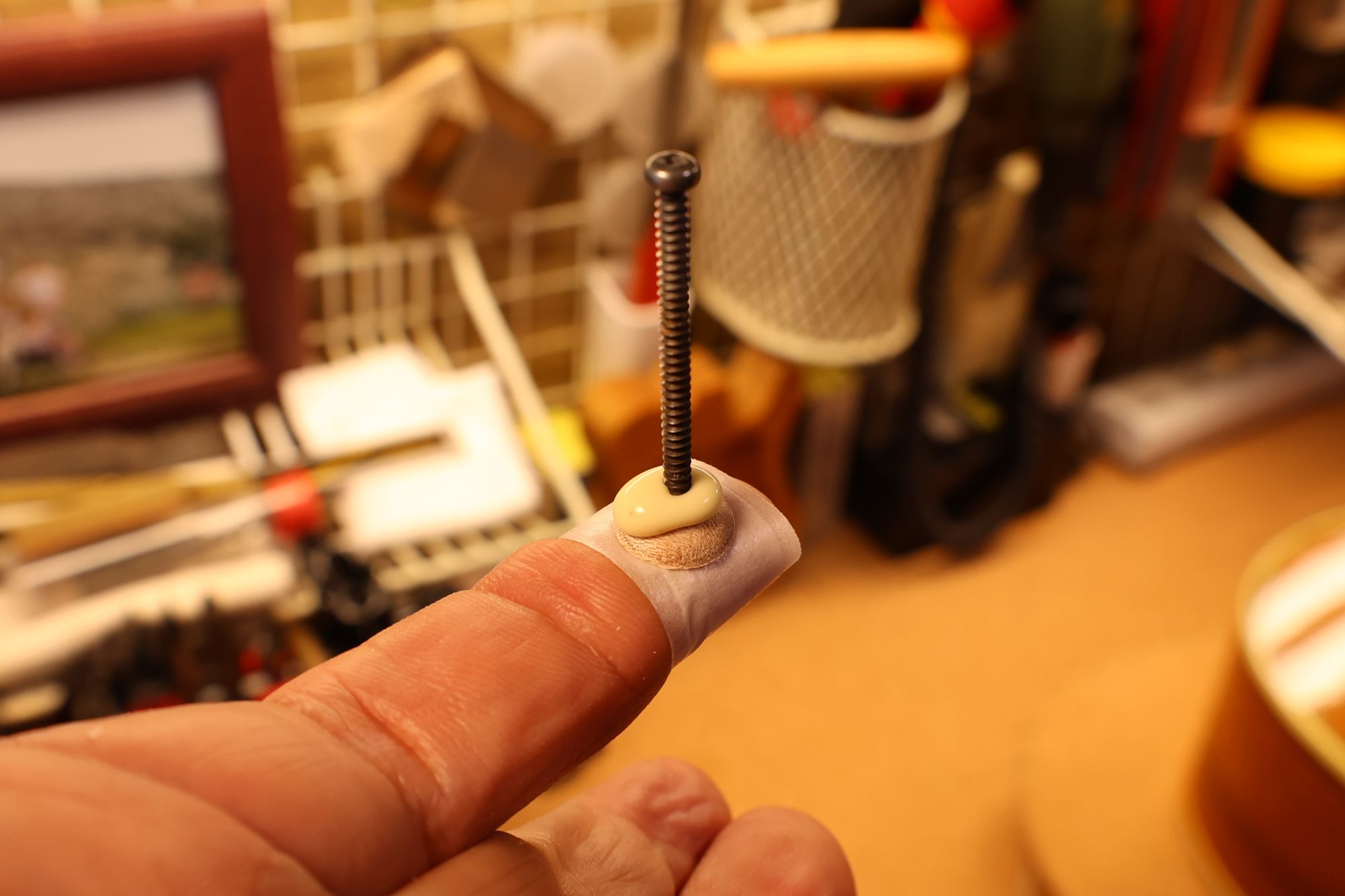 - 14.タイトボンドをプラグにつけて、小ネジを中央の穴にねじ込みます(この小ネジも半固定状態です)。