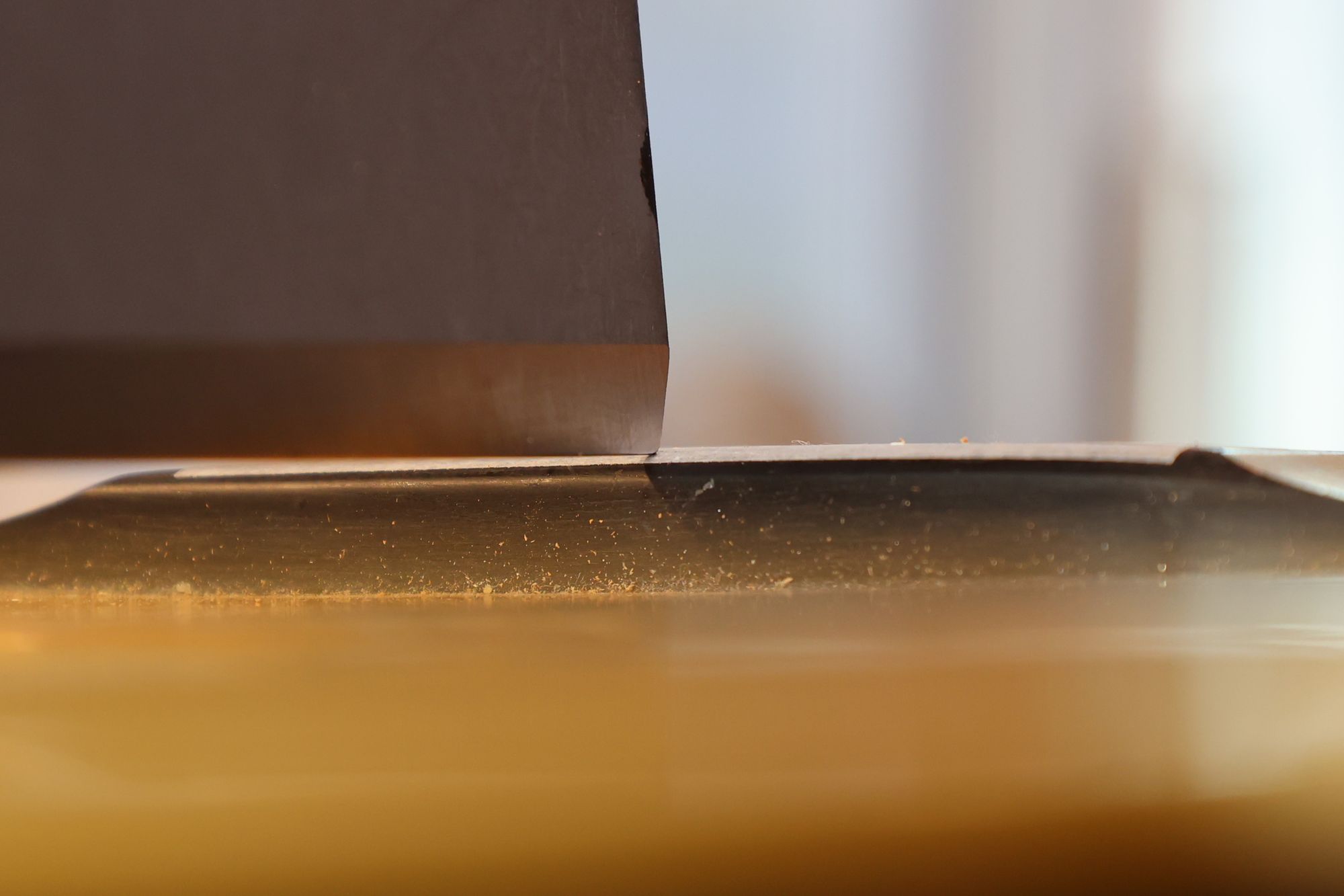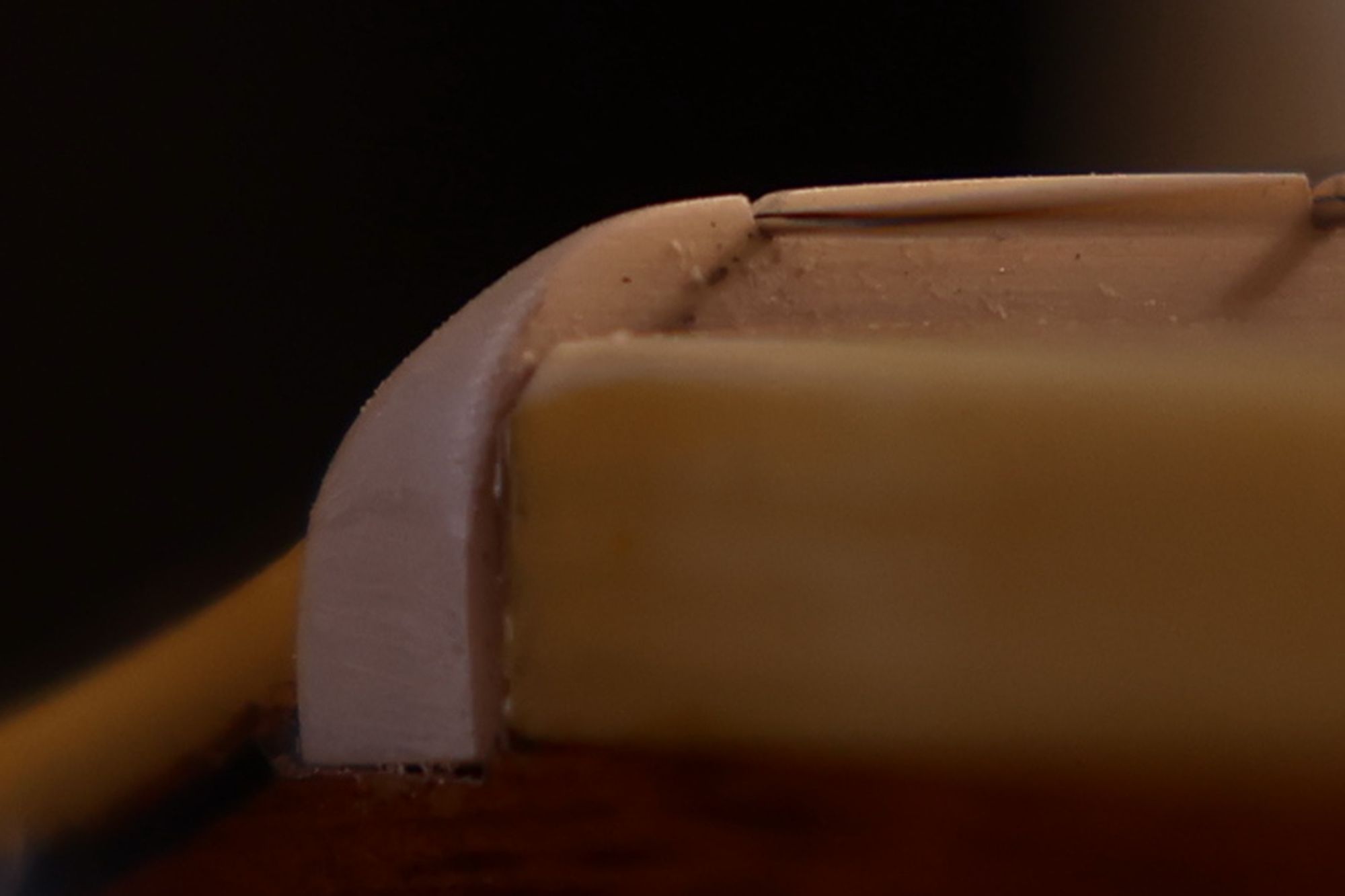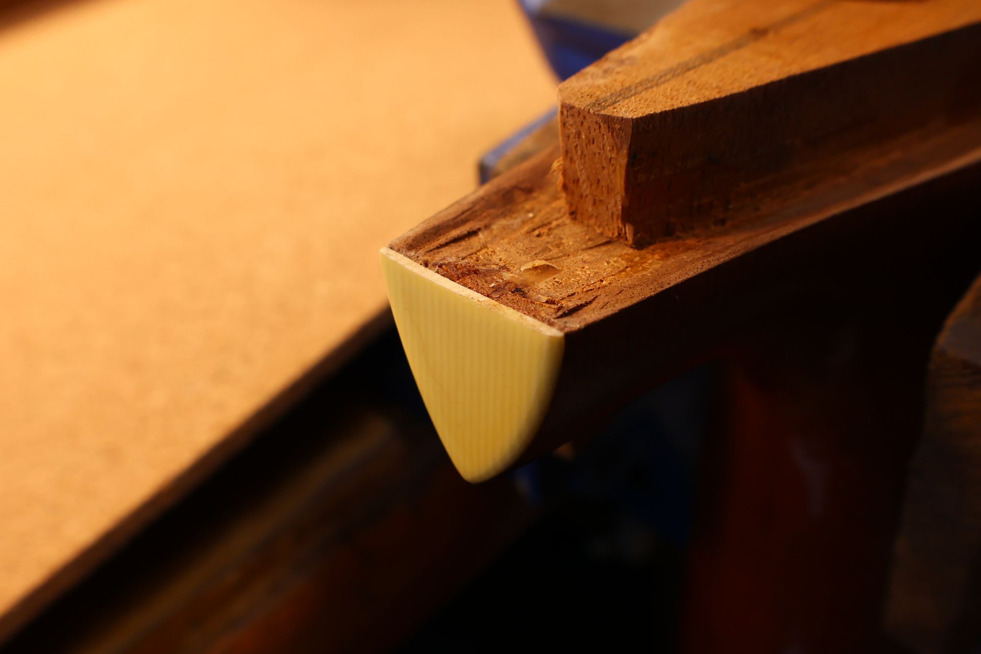 - 24.ネック接合部を削っていきます。フィンガーボード側(右)は削らず、ヒール部(左)だけに傾斜を持たせるように加工していきます。