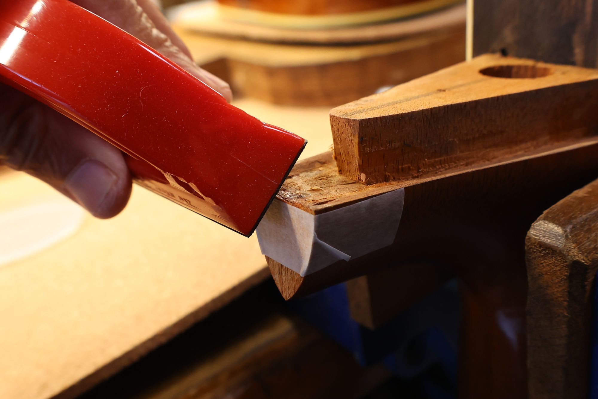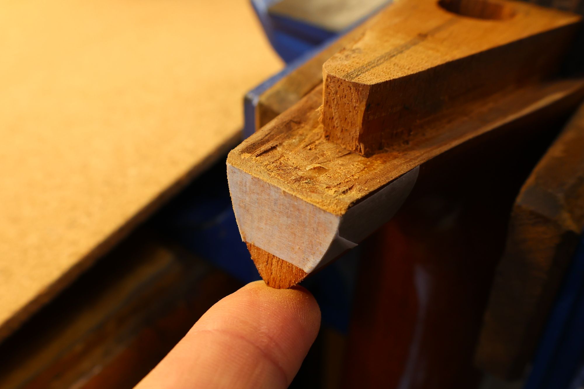 - 21.ネックヒール部です。マスキングテープを貼り、この部分の微妙な高さを目安に作業を進めていきます。