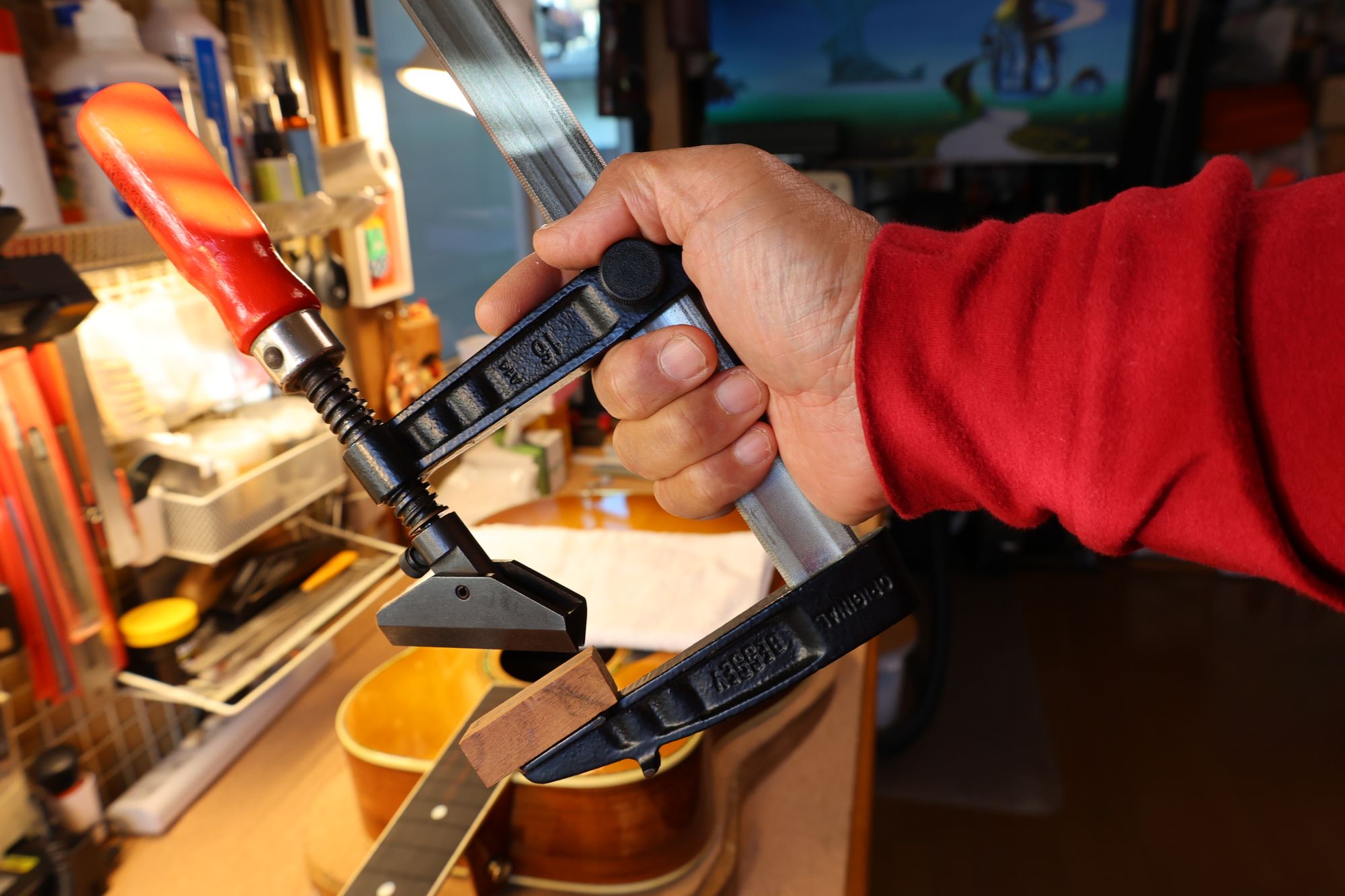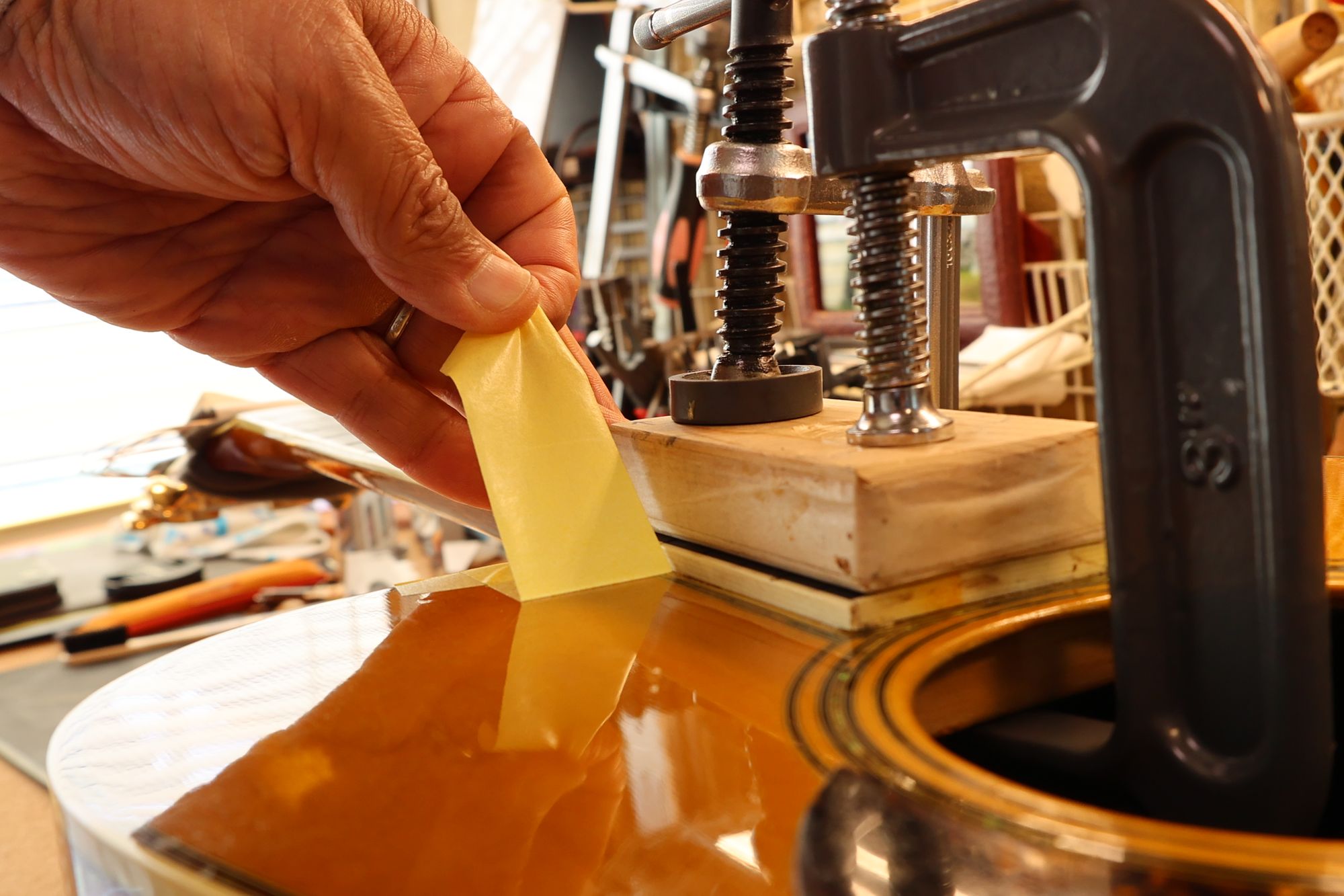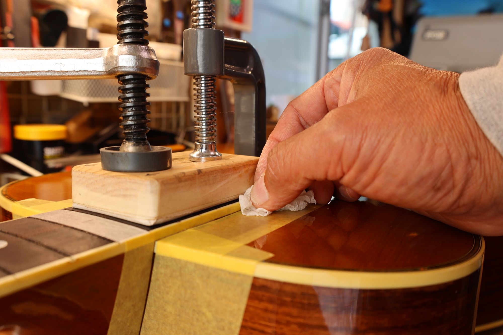 - 42.クランプと当て木でネックを固定し、あふれ出た接着剤をふき取っていきます。
