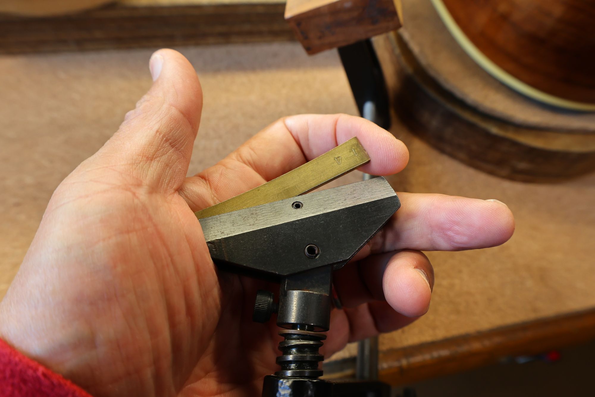 - 9.ブリッジ表面のハンドルを回して、カッターを回転させ、ブリッジプレートの凹み加工を行います。