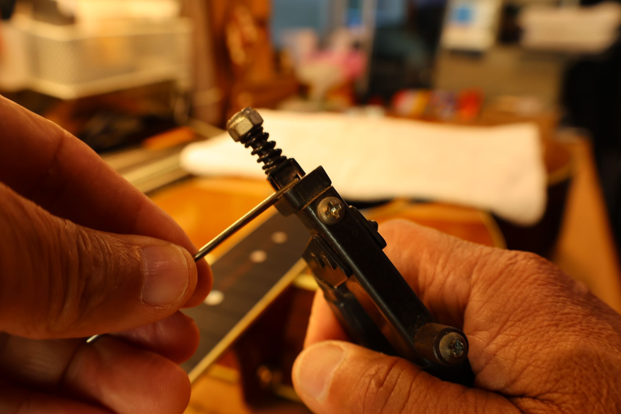 - 21.弦を張って弦高調整を行います。2フレットを指で押さえて1フレットと弦の隙間がギリギリに下がるまでナット高を下げます。