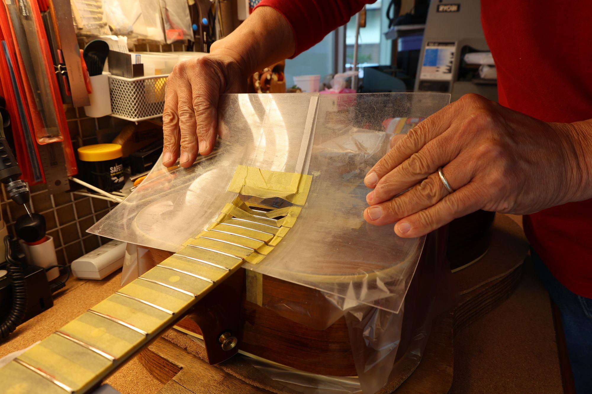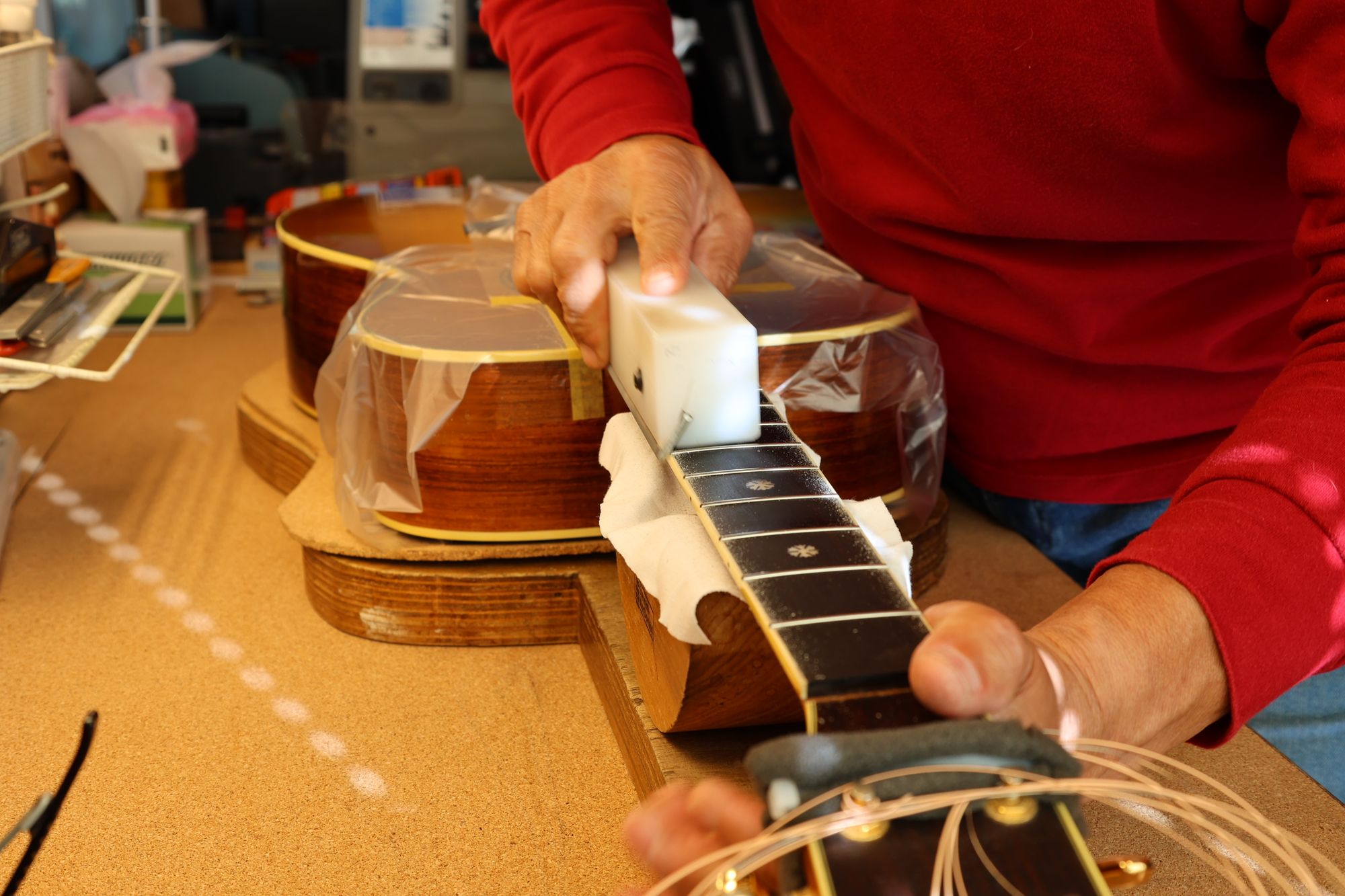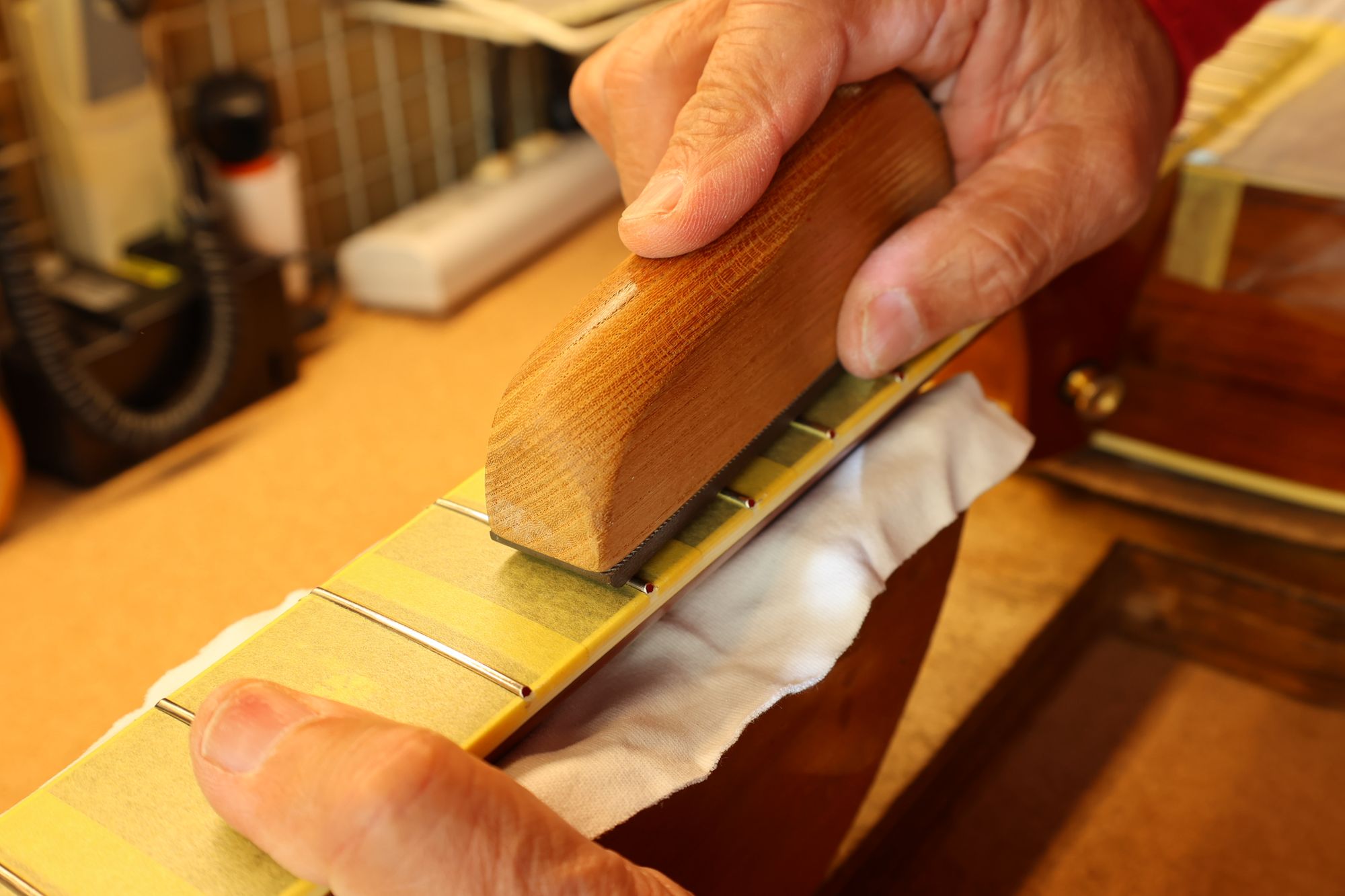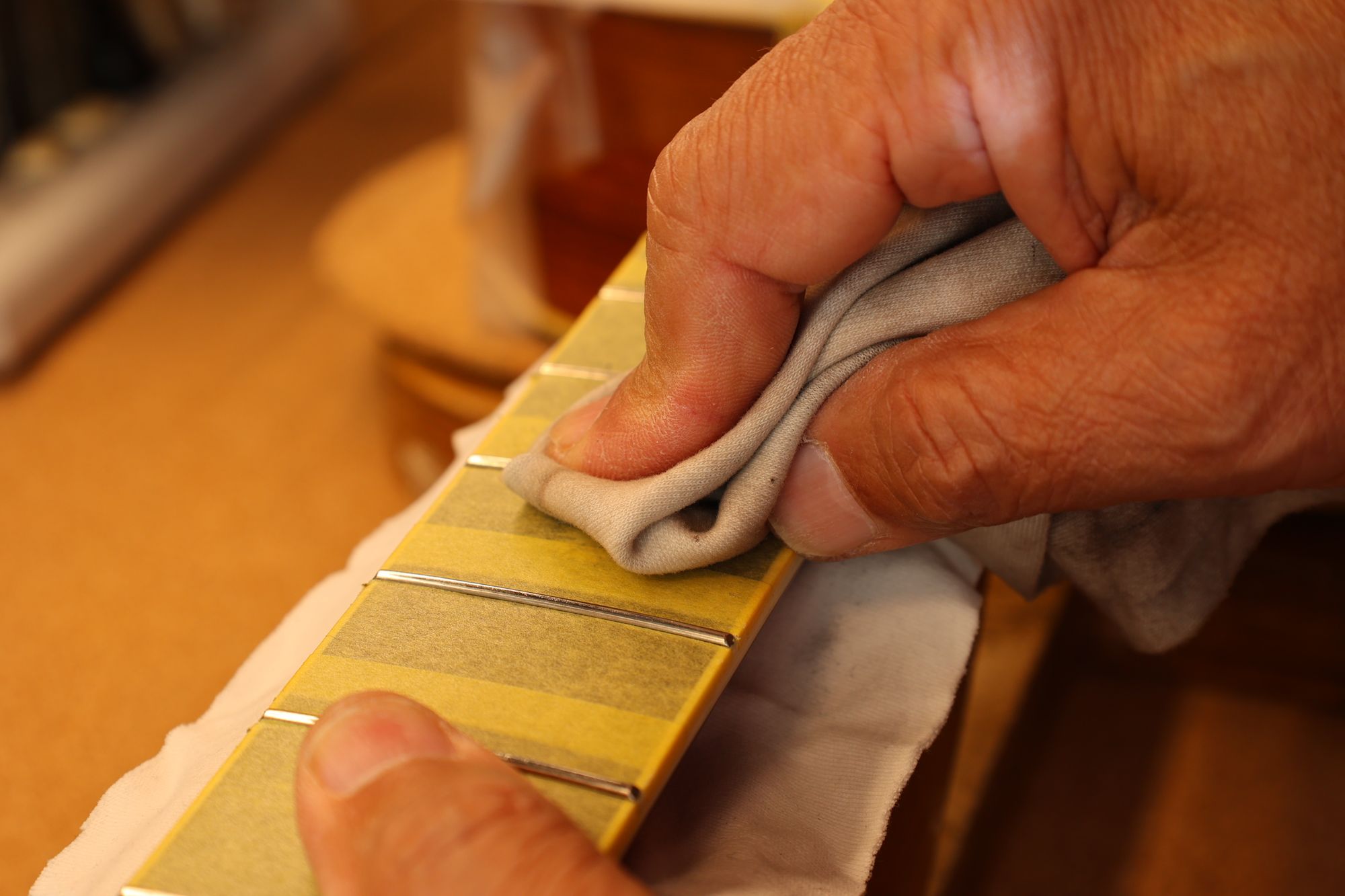 - 35.引き続いてフレットすりあわせを行いましょう。マスキングテープでフィンガーボードを保護します。
