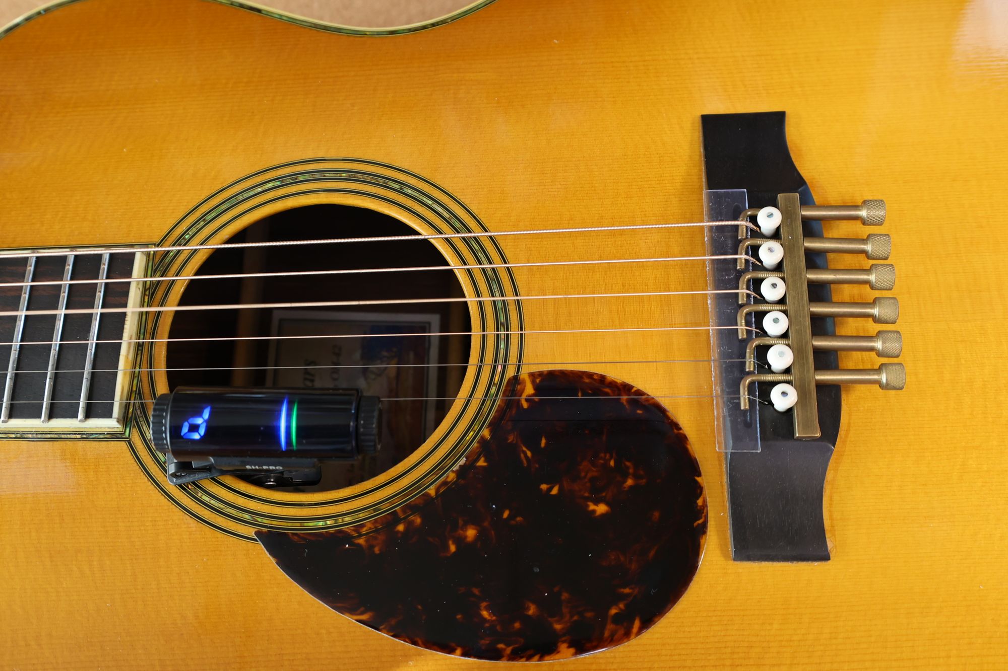 - 1.サウンドホールにチューナー、サドル位置にイントネーターを取り付けました。