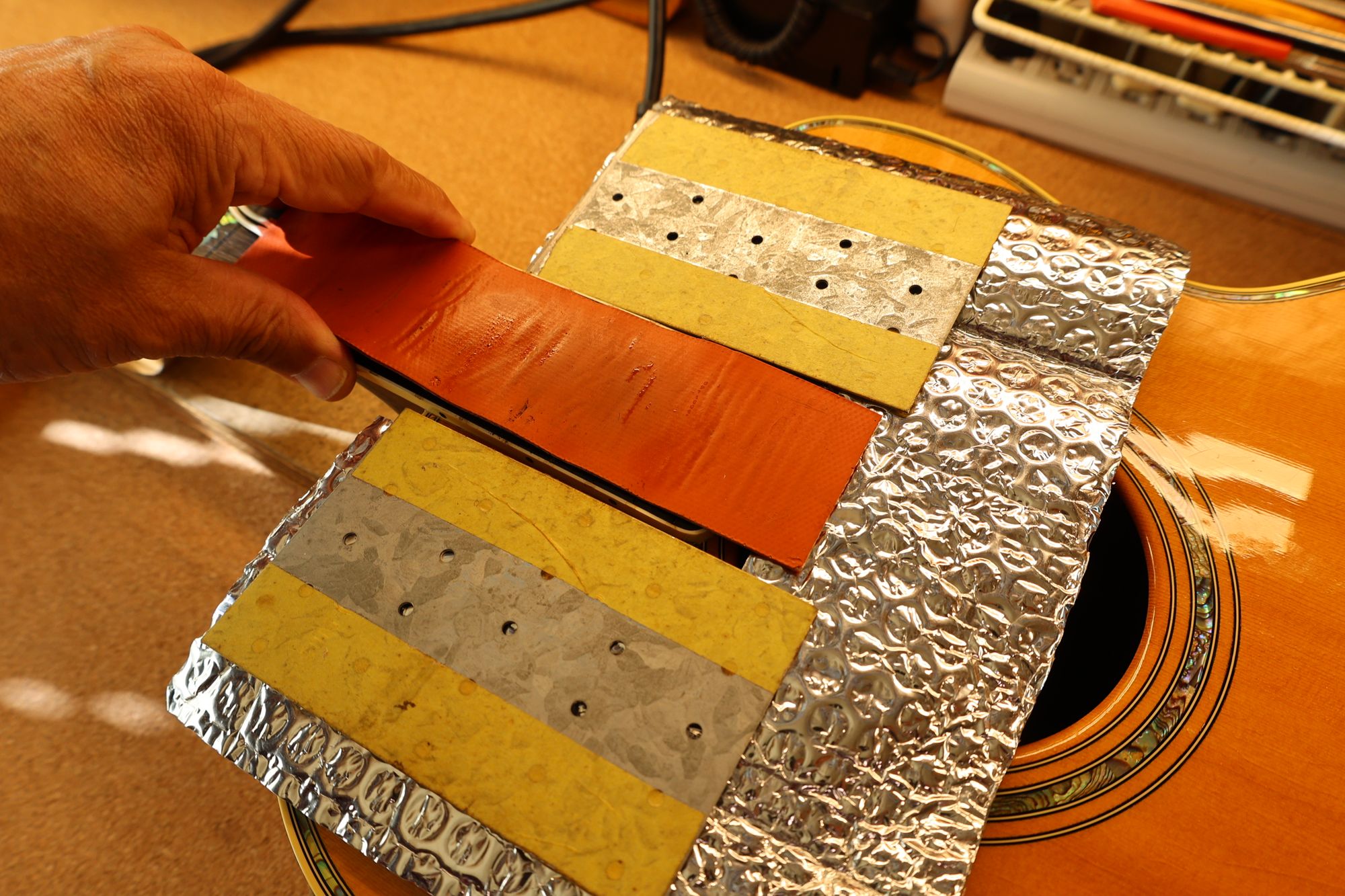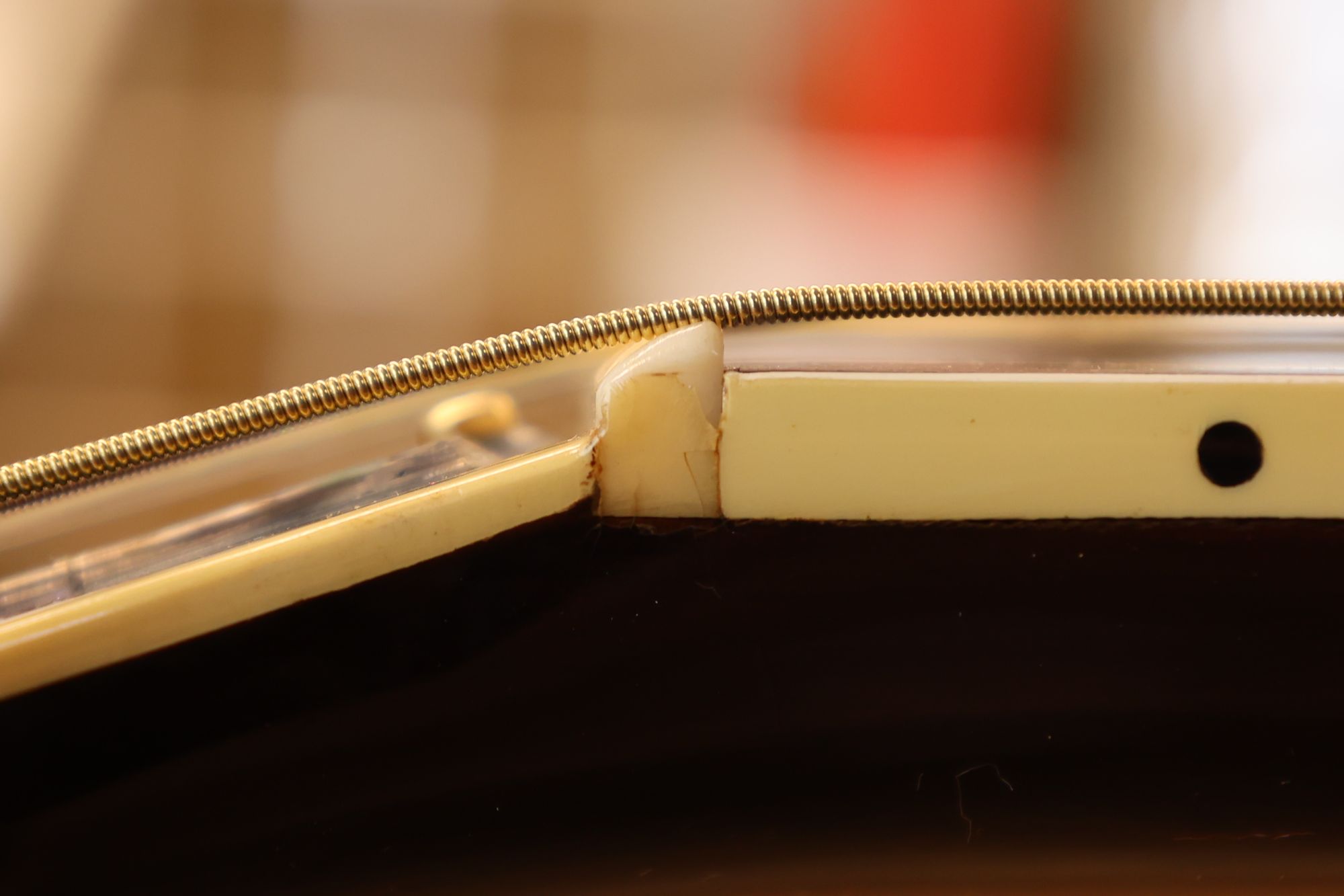 - 1.ボディ内部ブリッジの裏側に取り付けられているブリッジプレートです。弦のエンドポールが食い込んでしまう状態になっています。