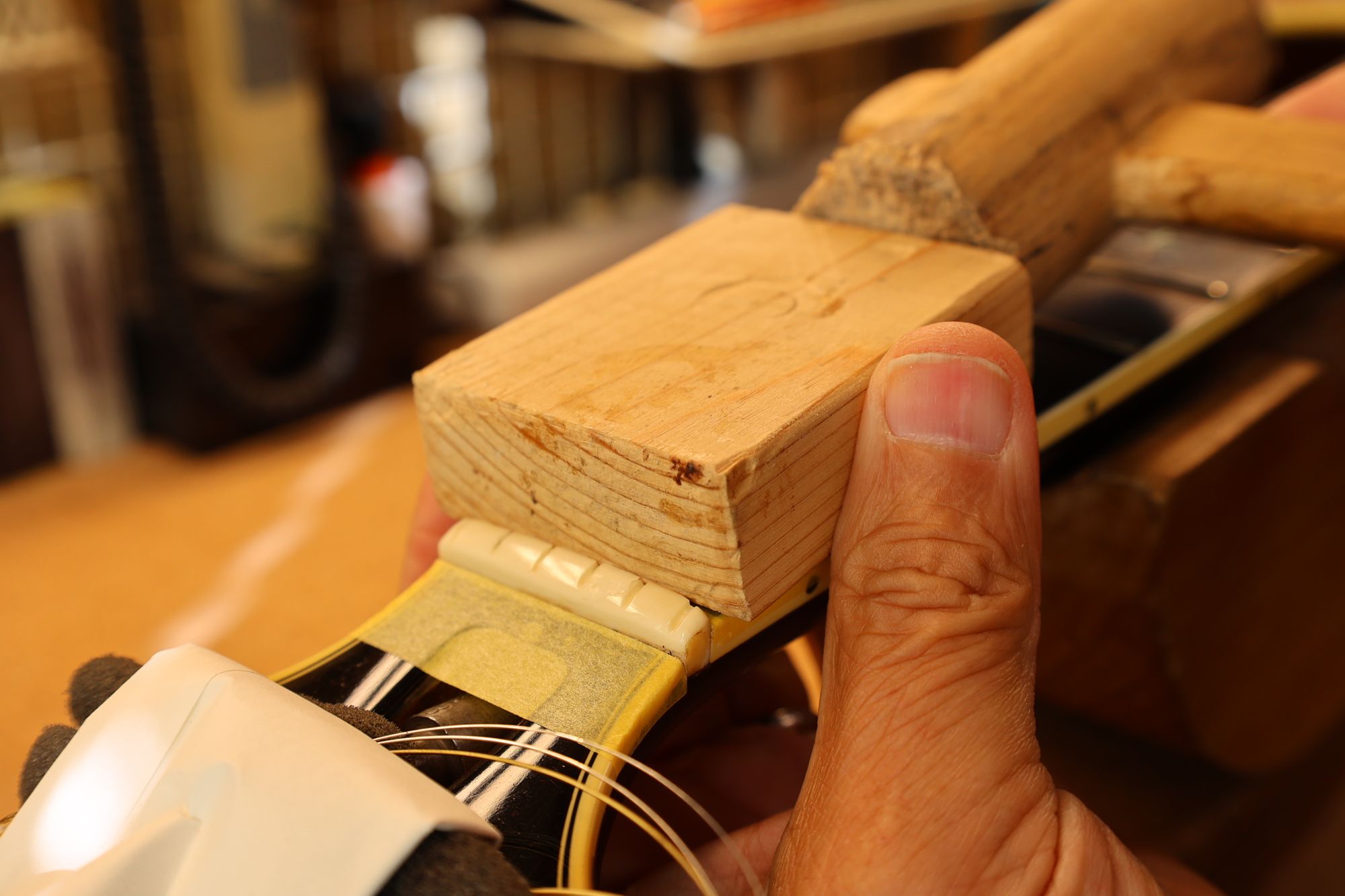 - 22.ストリングリフターで弦を待避させて、ナット溝を徐々に下げていきます。