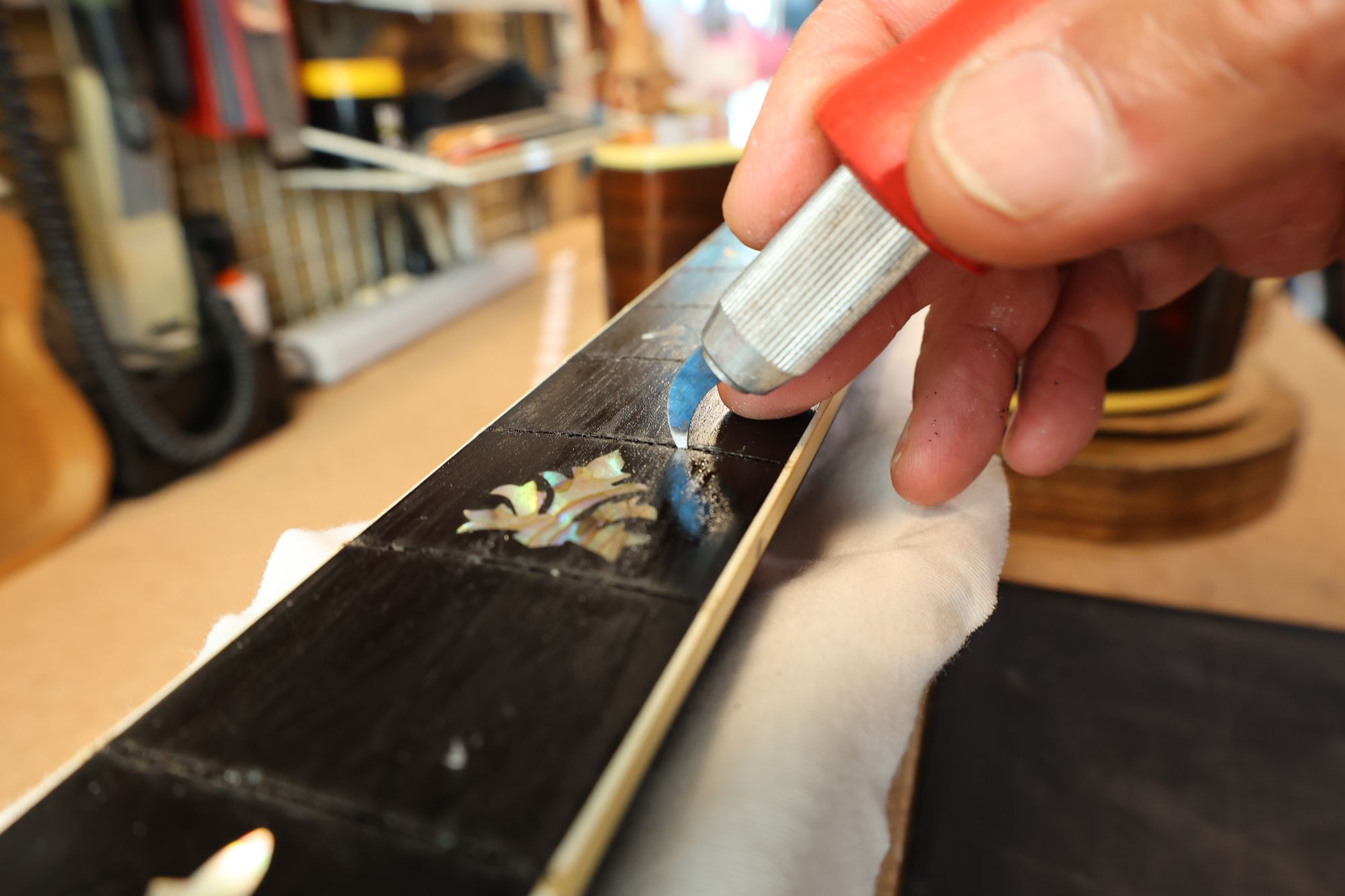 - 3.フレット交換の前にフィンガーボードにあけた穴を元に戻しましょう。穴径にあうようにエボニー片を丸く削ります。