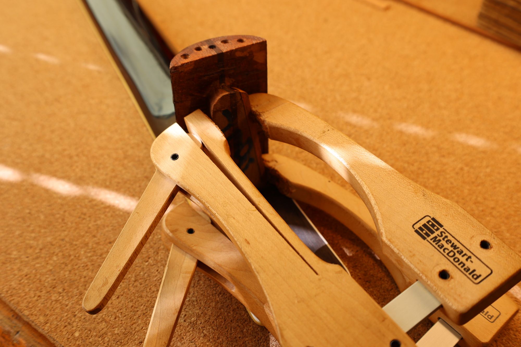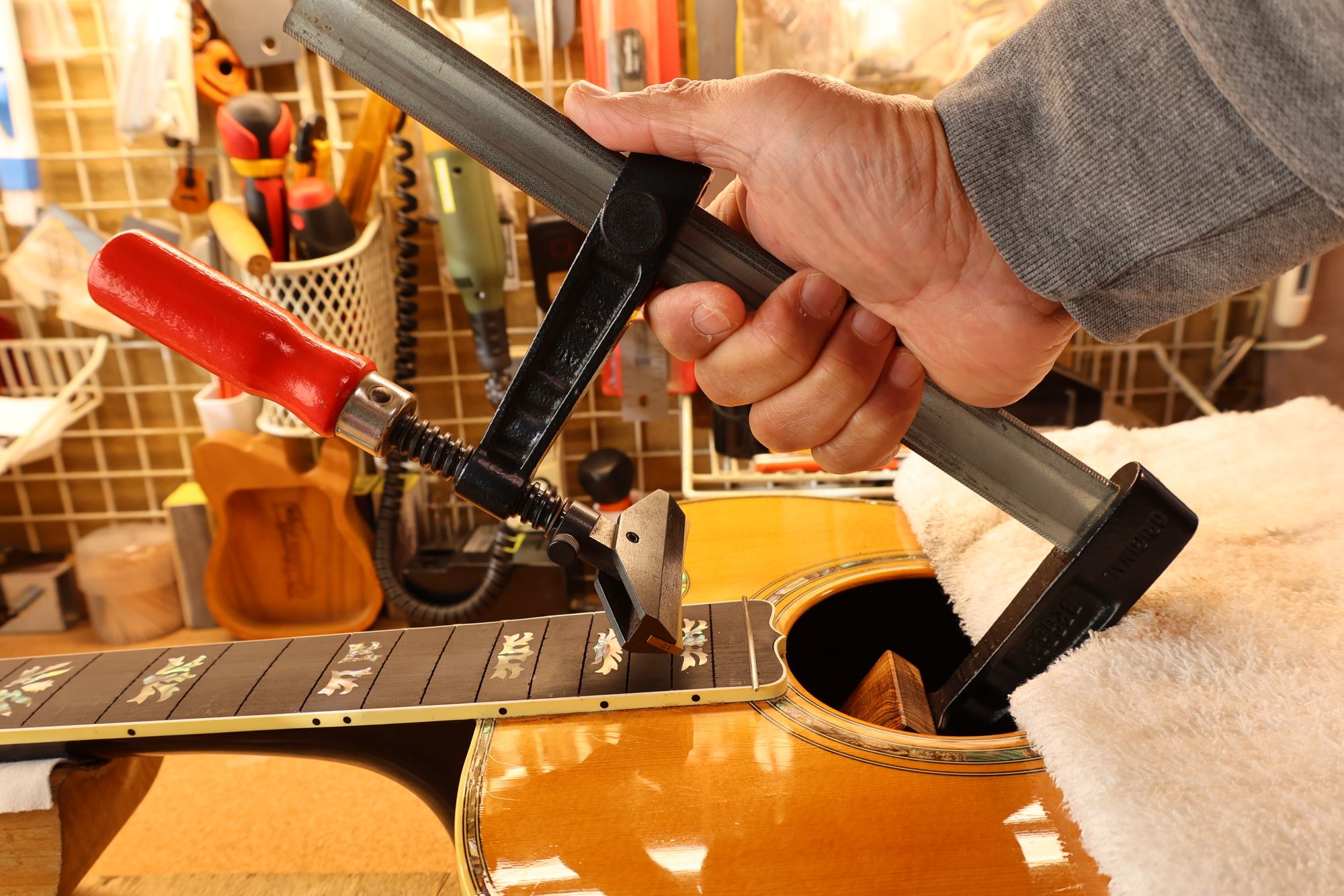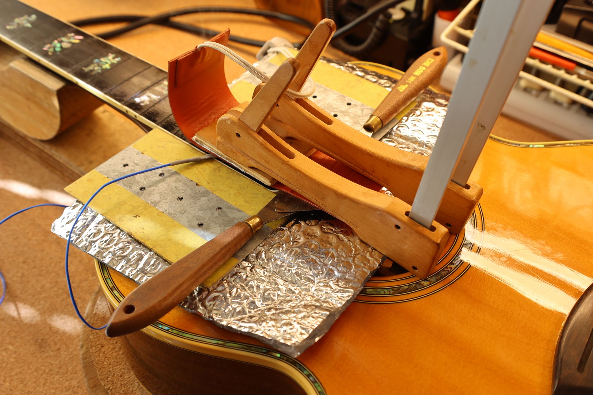 - 50.クランプと当て木でネックを固定し、あふれ出た接着剤をふき取っていきます。