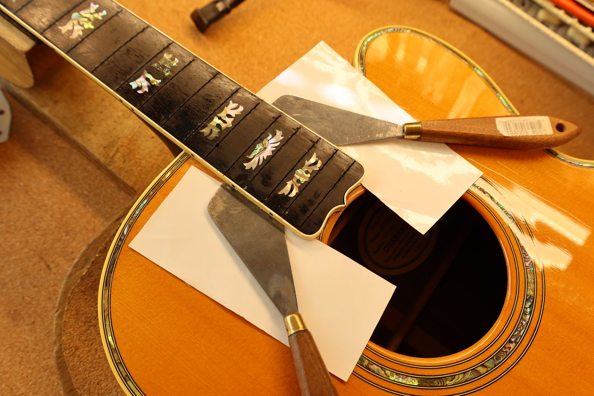 - 8.15フレット下部分までナイフが入りました。フィンガーボードとボディの取り外しが完了です。次にネックの取り外しを行いましょう。