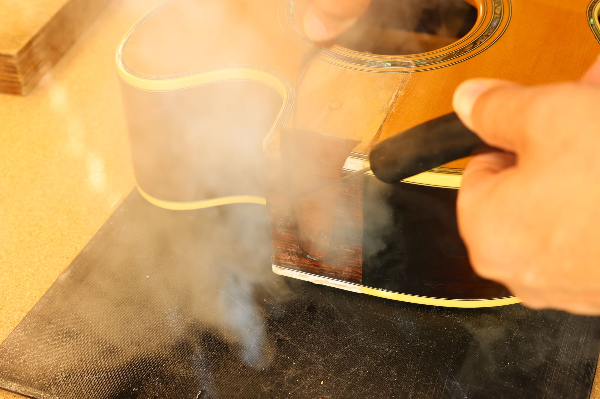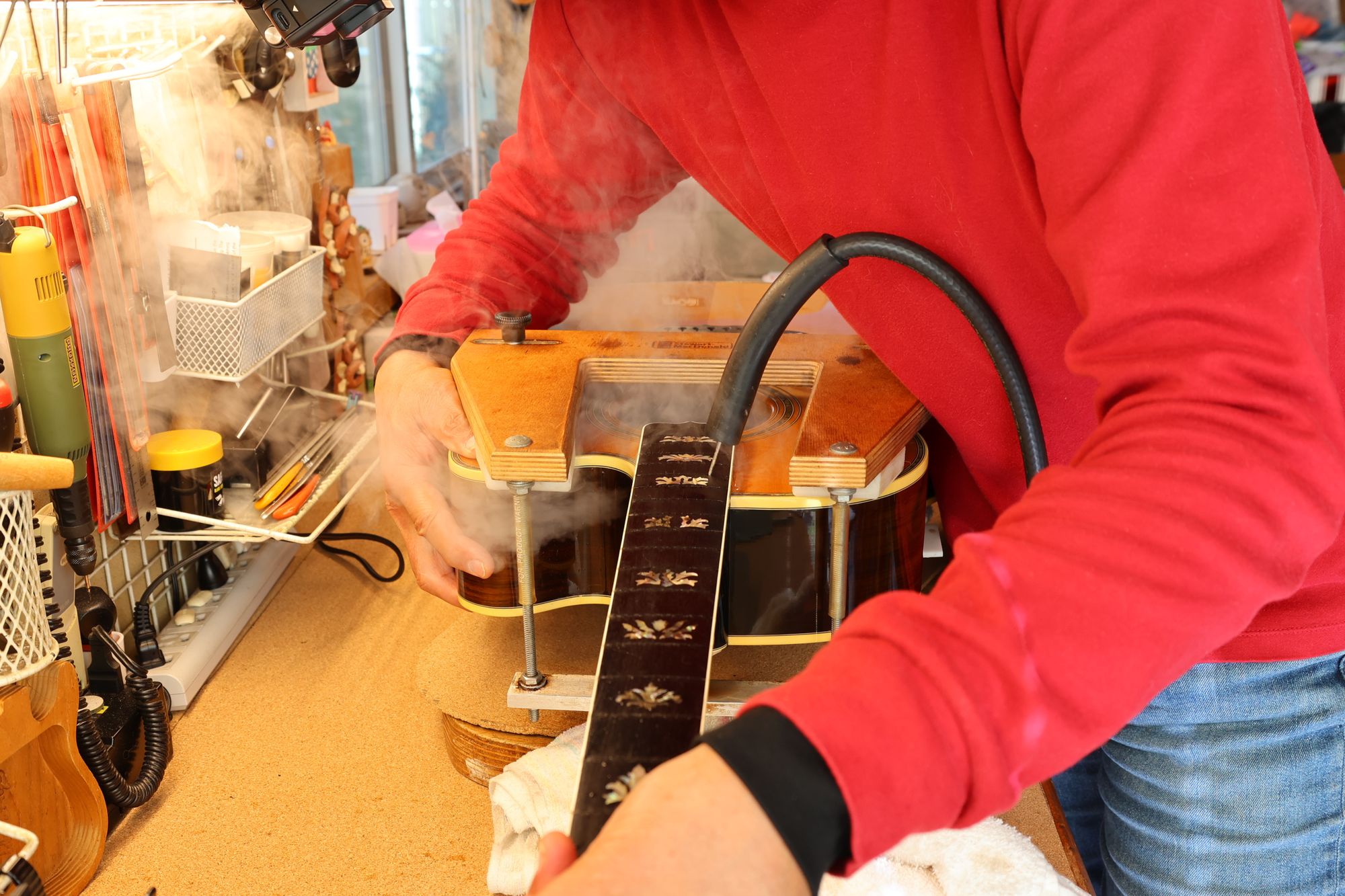 - 12.15フレットの穴に先端を差し込んで蒸気を発生します。かなりの高温蒸気が発生しますので、ギターと体へのやけどには要注意です。