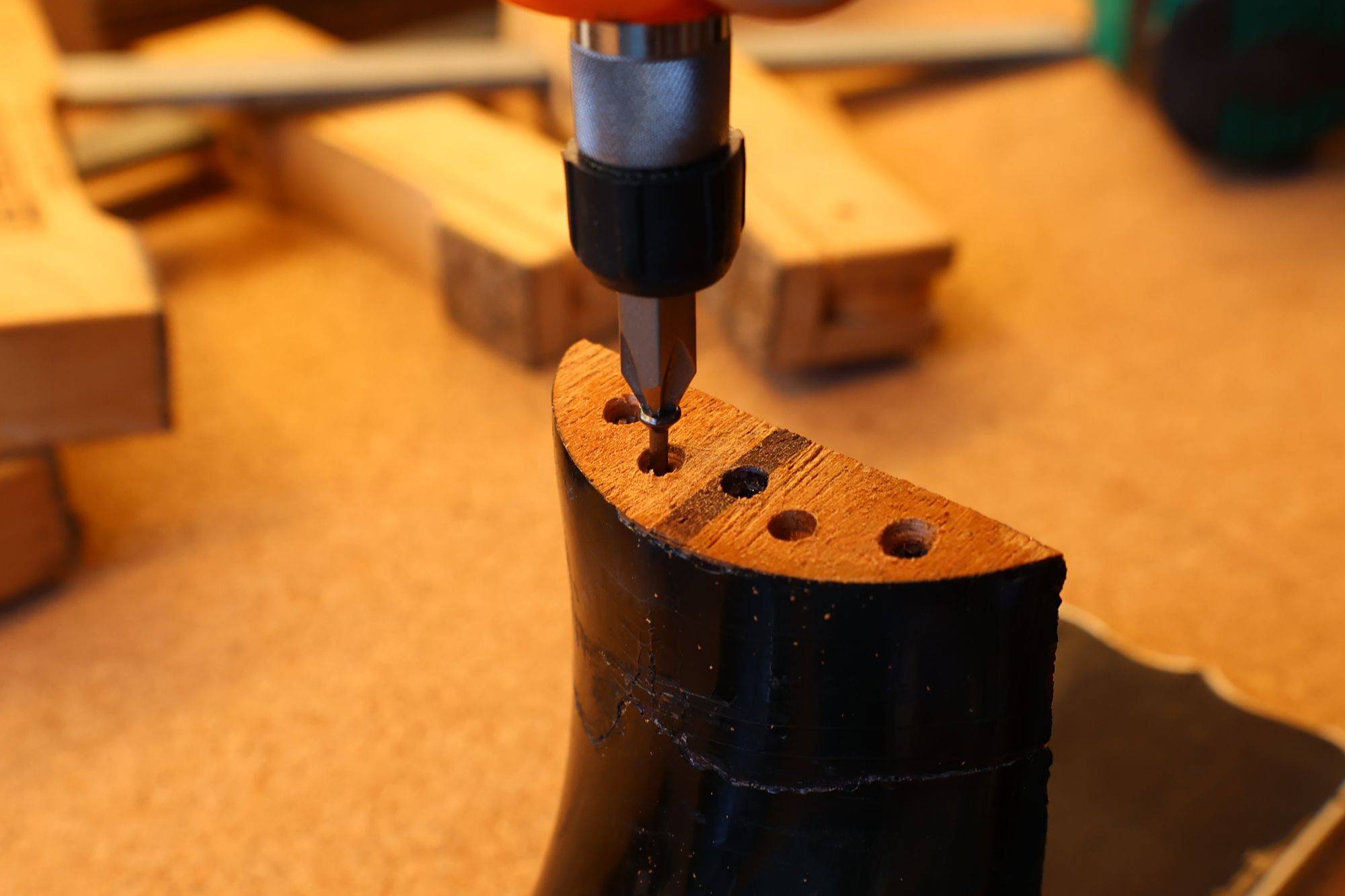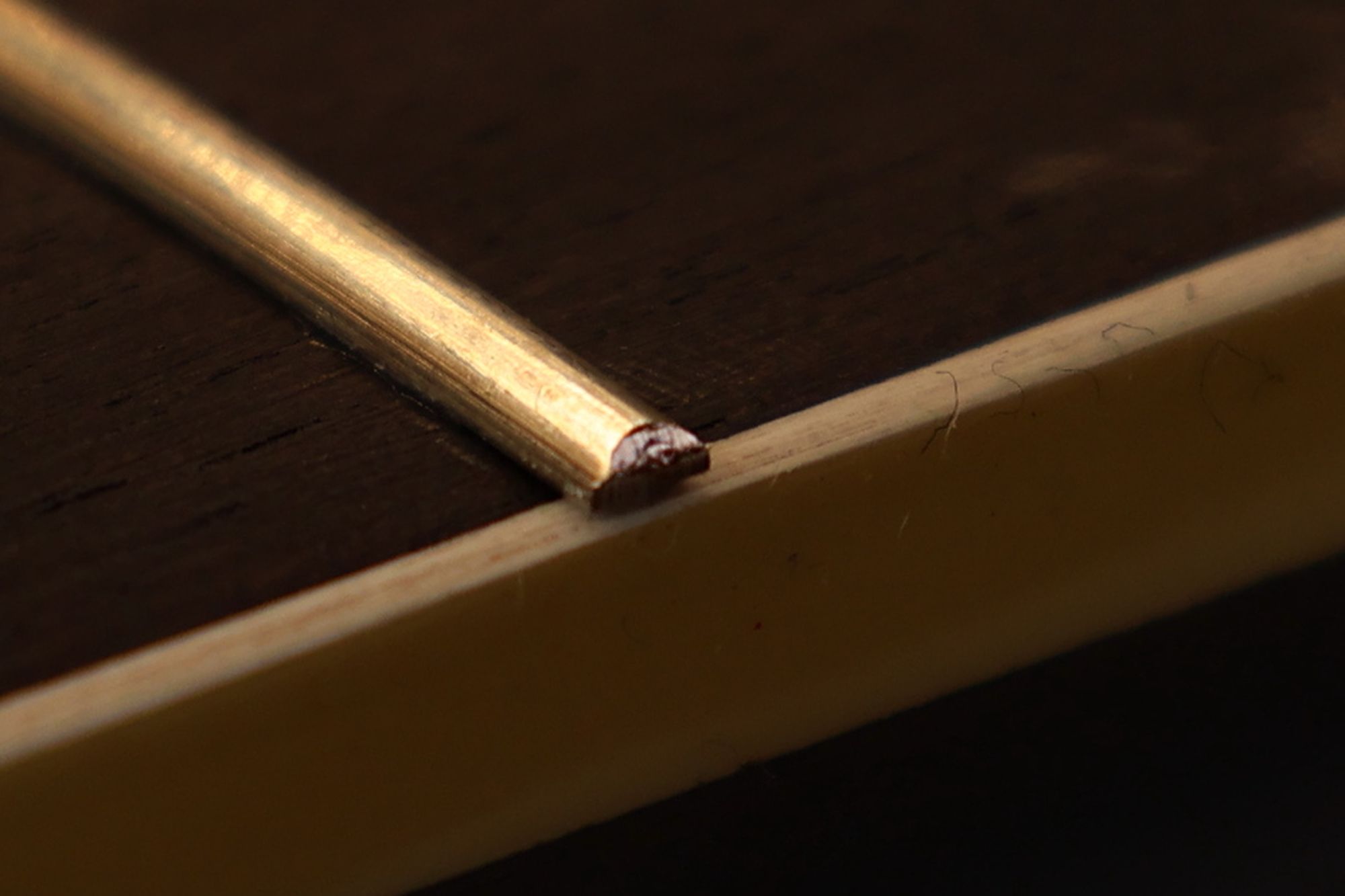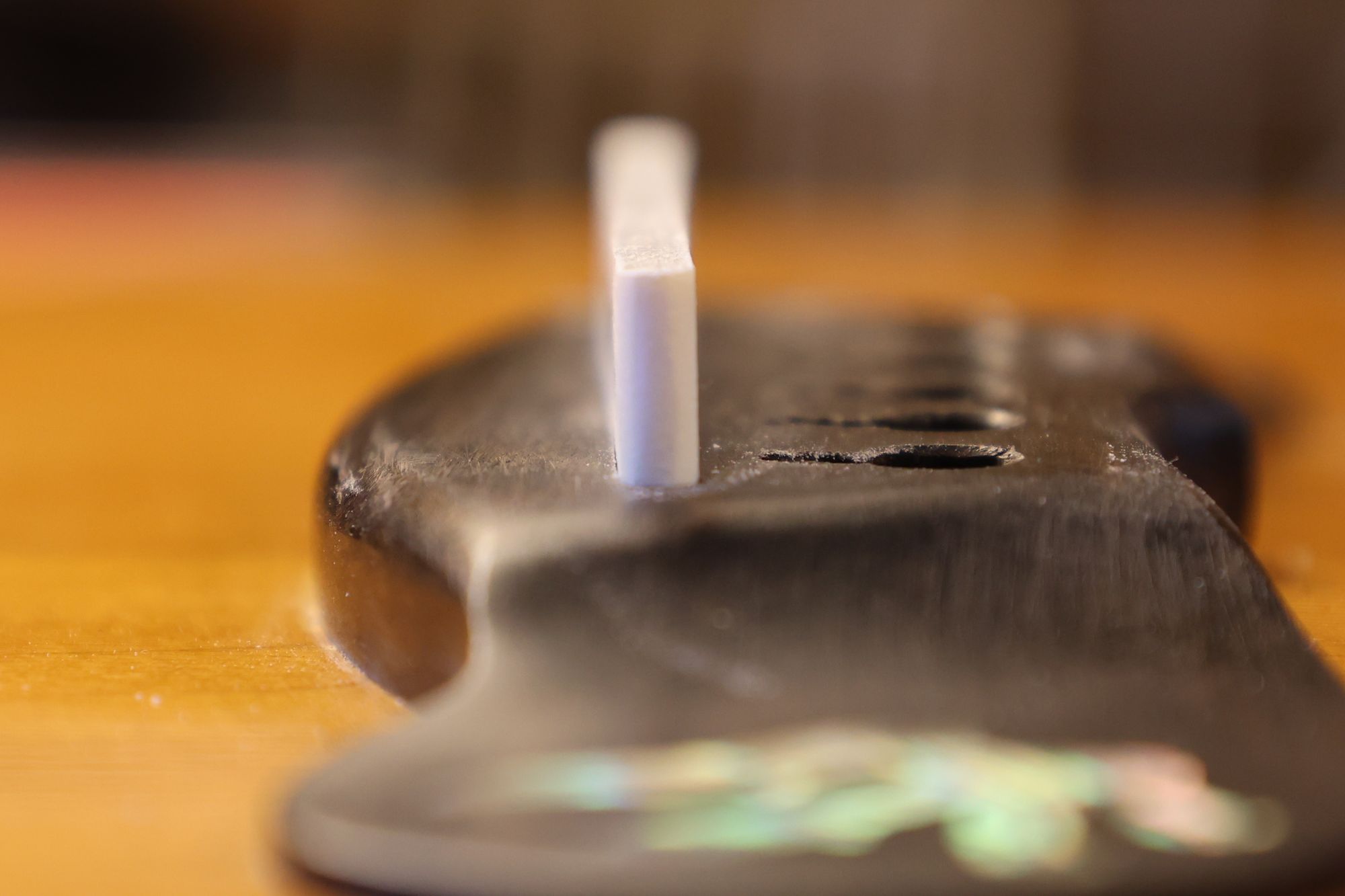 - 4.ドリル穴にエボニー材を押し込み、フィンガーボードを傷つけないように出た部分をカットします。