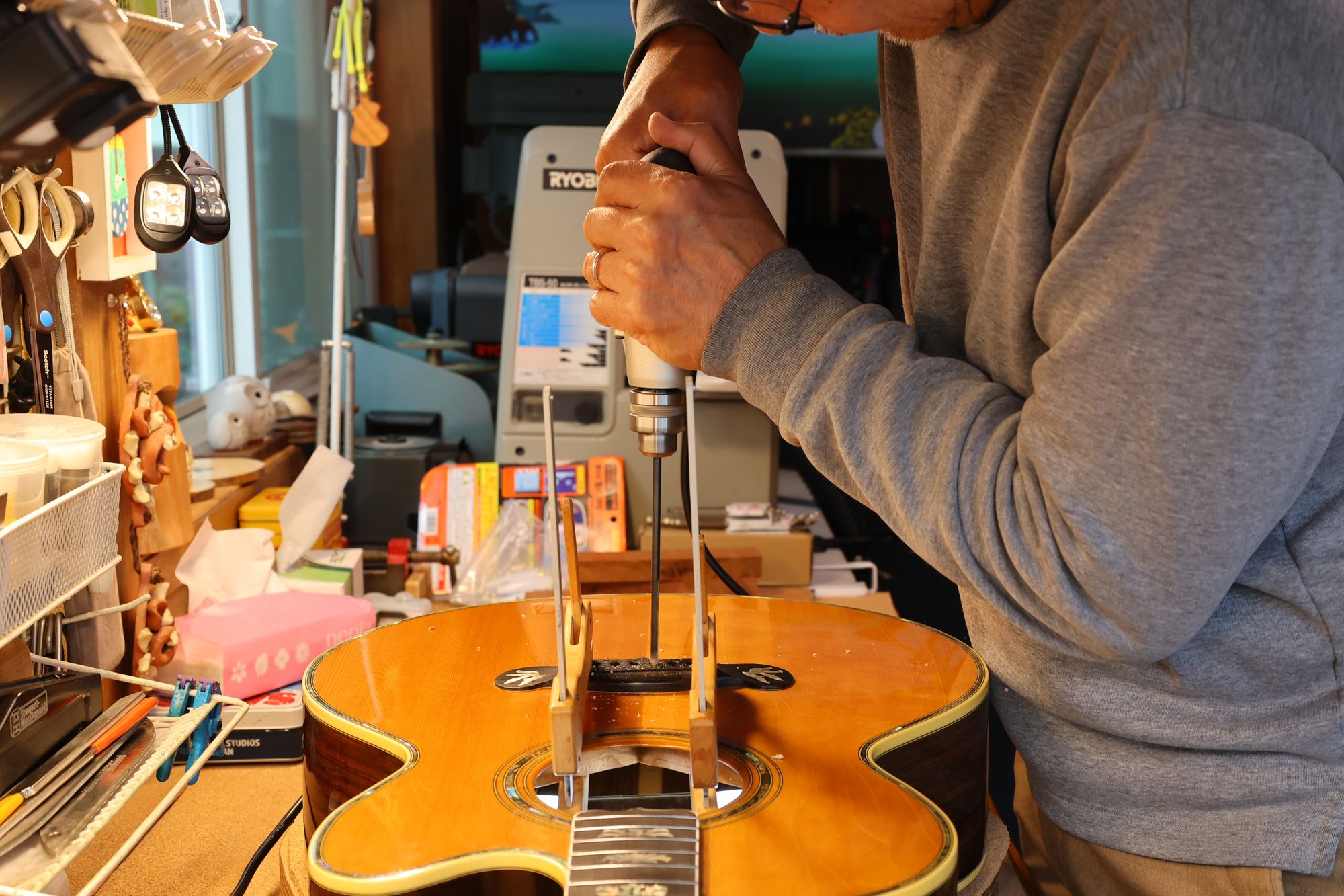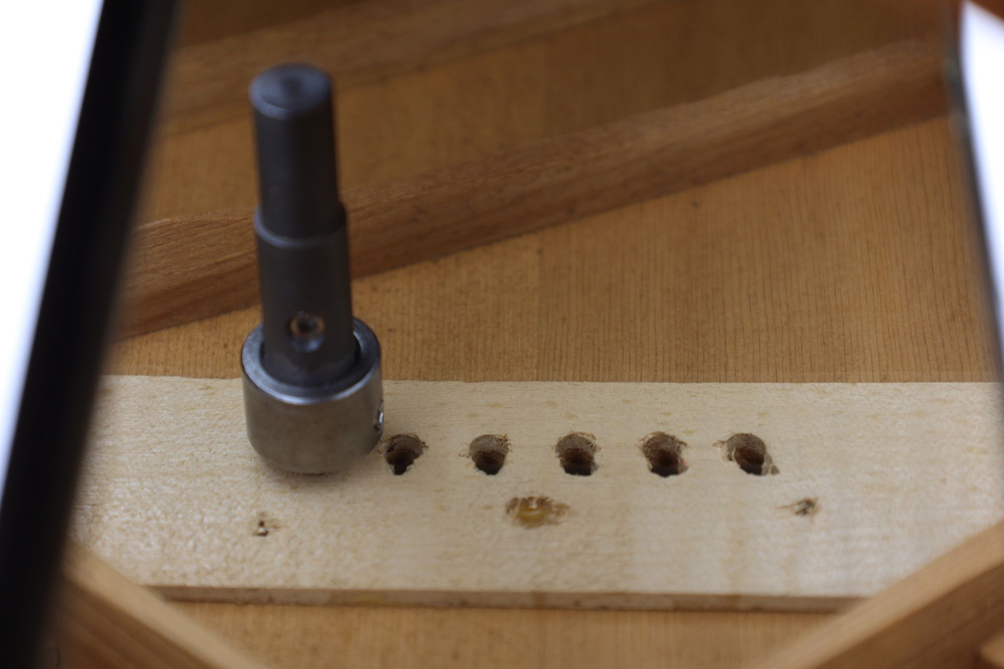- 13.さらにミニルーターで弦の導出角度をつけていきます。